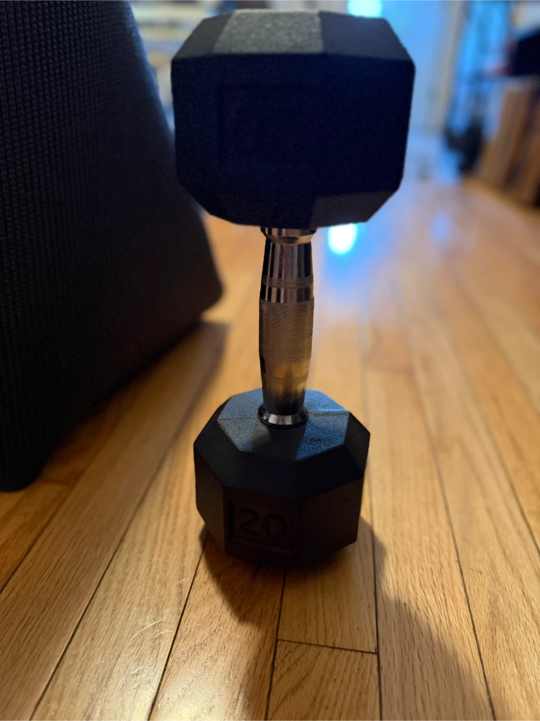 72Selling a black foam roller from RONTEN! It's in great condition and perfect for muscle recovery after workouts. It's lightweight and portable, making it easy to take with you to the gym or on the go 20lb dumbell and yoga Mat as well. Sold together or separately