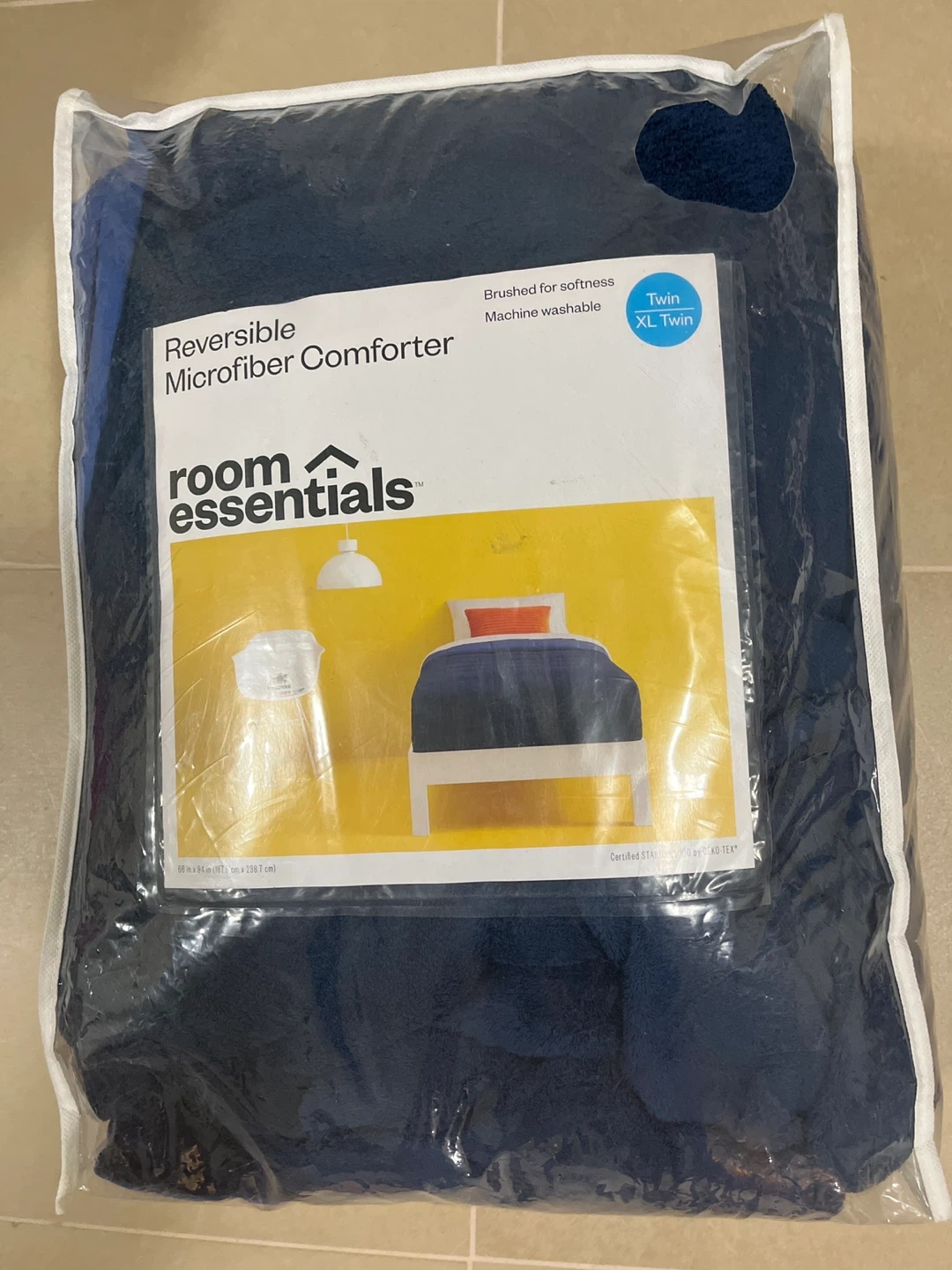 Selling a Room Essentials reversible microfiber comforter, perfect for a twin or XL twin bed! It's still in the original packaging and ready to keep you cozy. Brushed for softness and machine washable for easy care