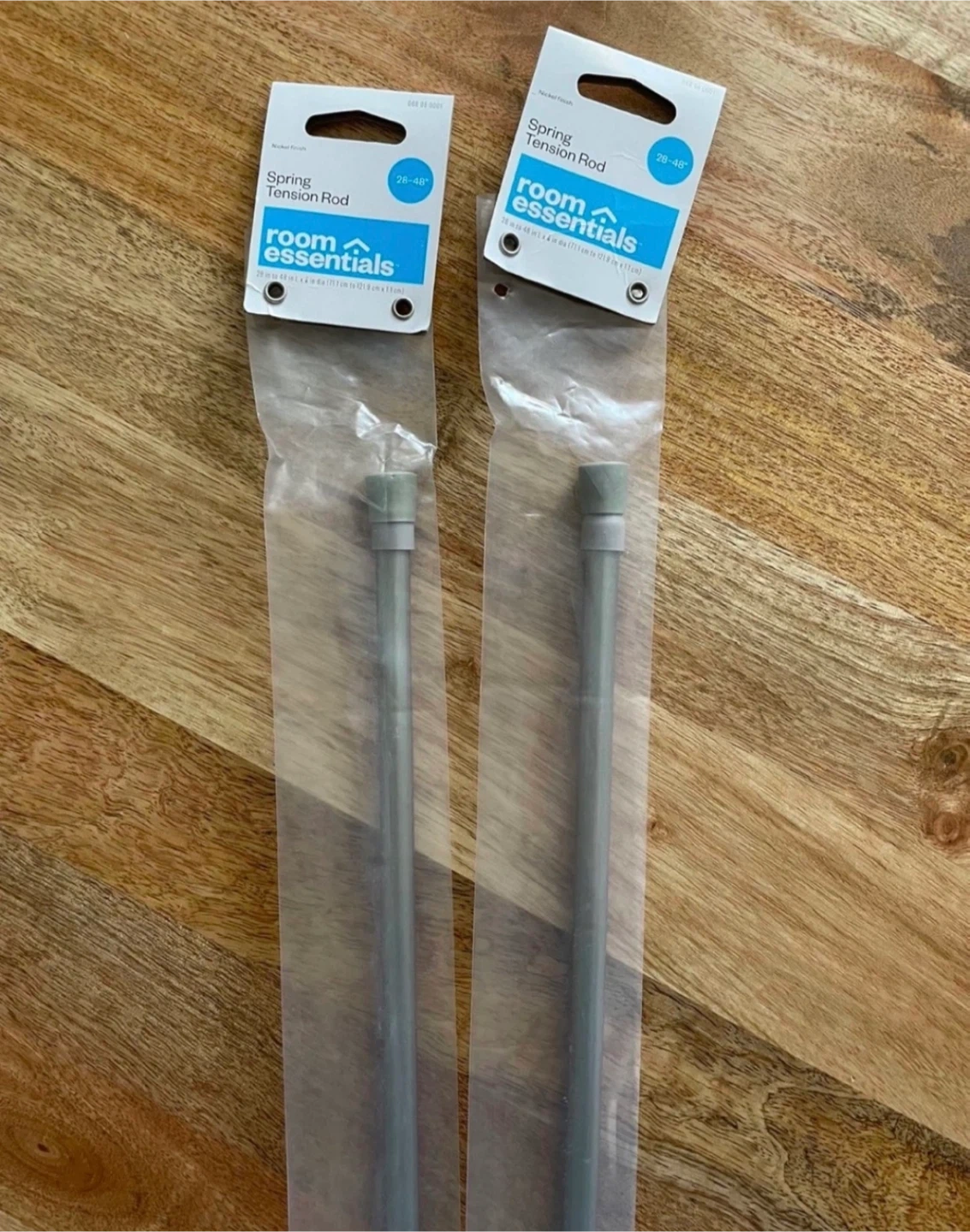 10Two Room Essentials spring tension rods, still in their original packaging! They're a nickel finish and can extend from 28 to 48 inches.