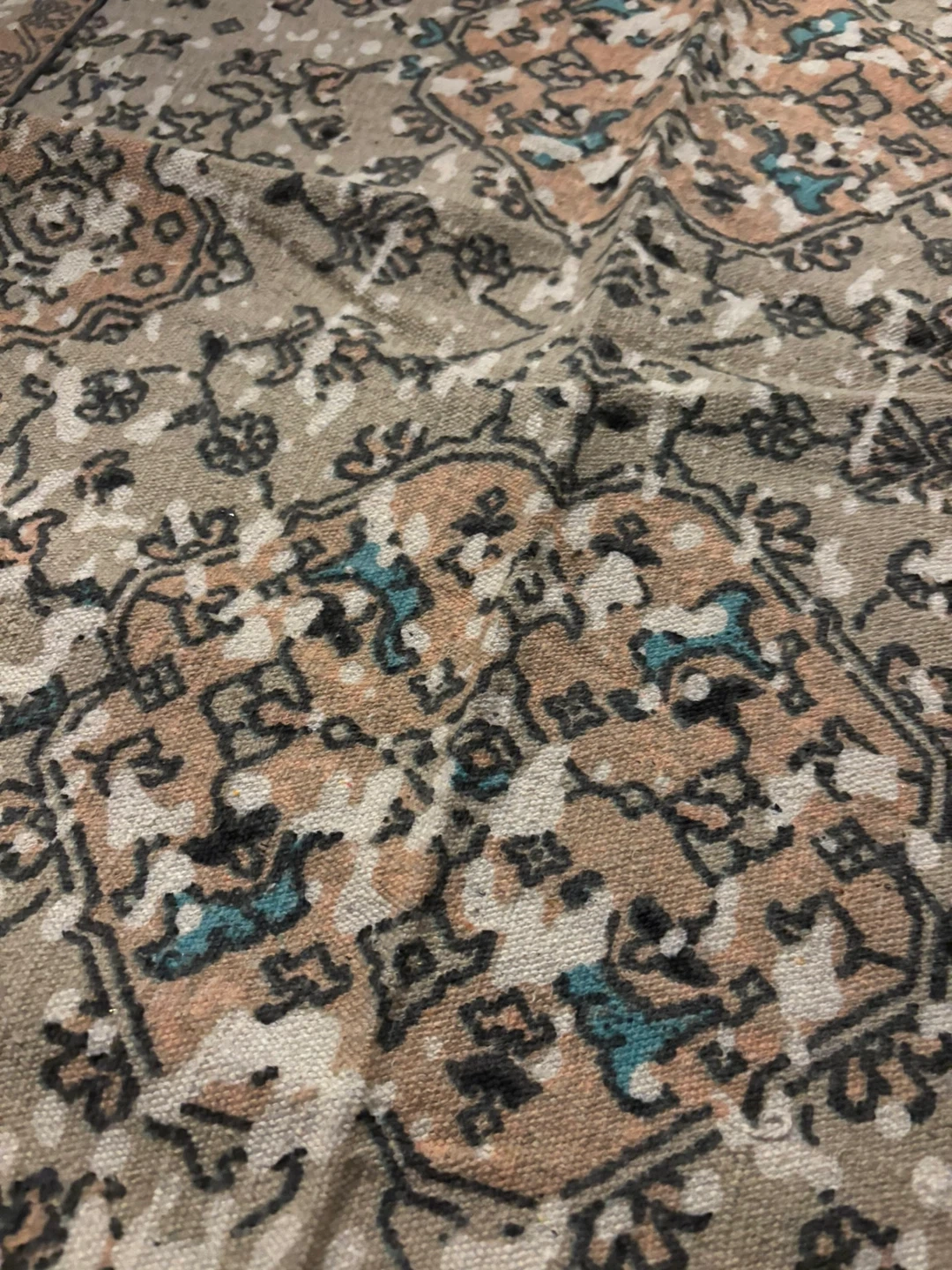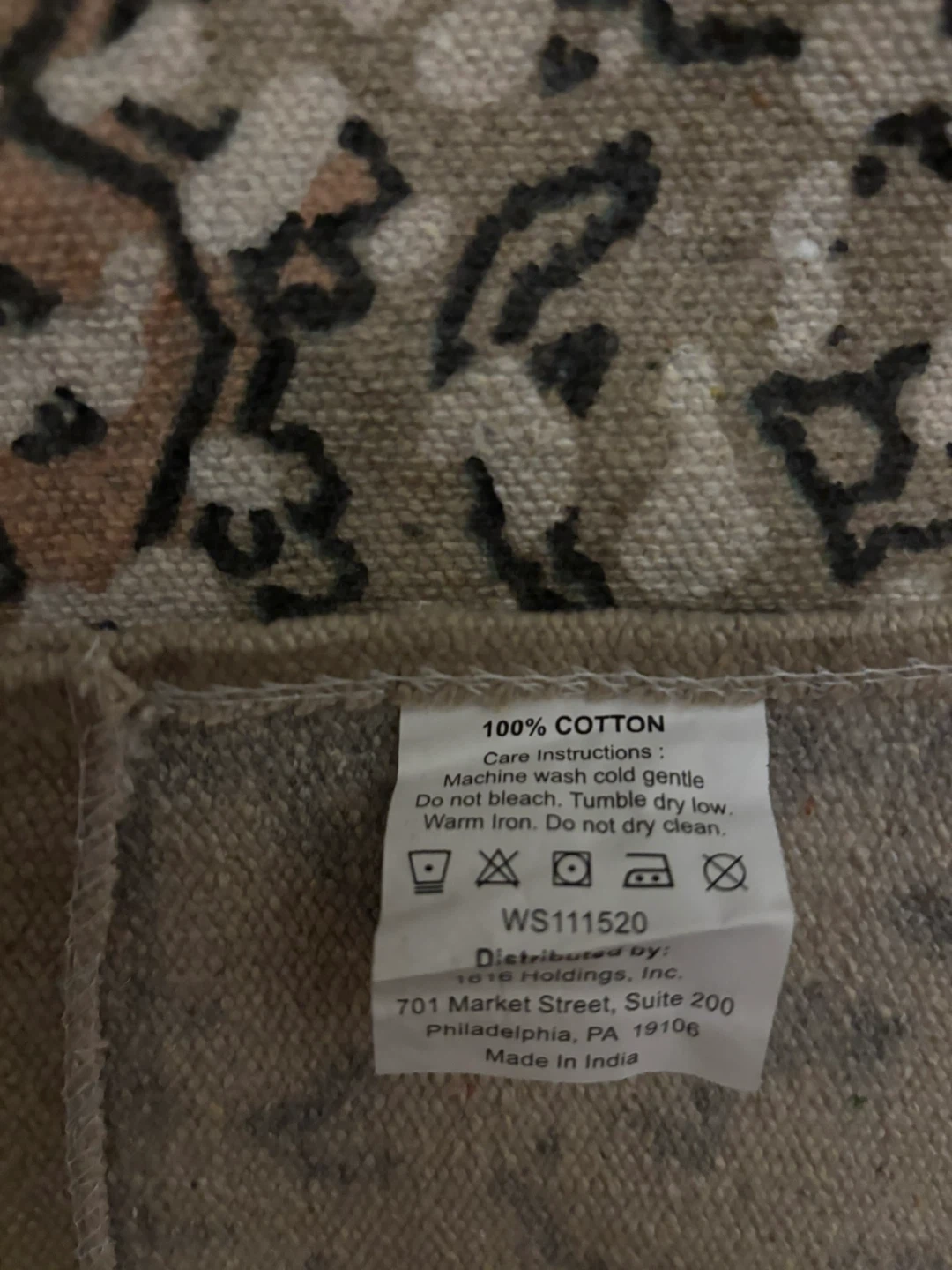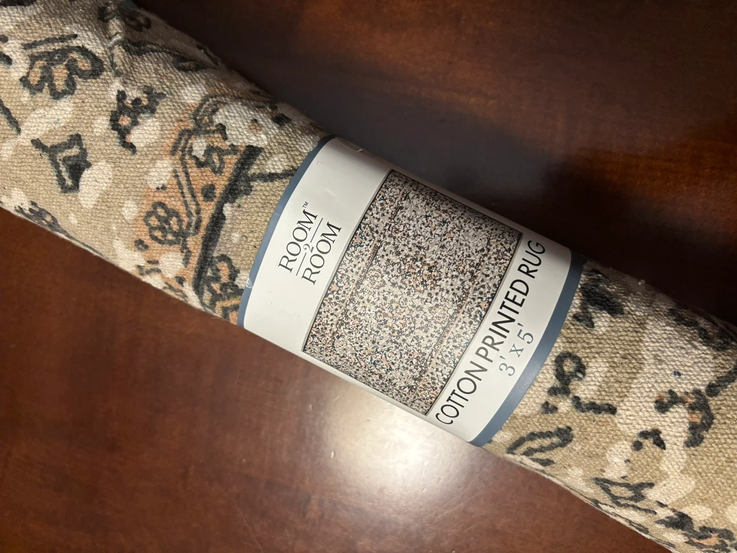 Selling a Room Room cotton printed rug, sized at 3' x 5'. It's made of 100% cotton. The care instructions are: machine wash cold gentle, do not bleach, tumble dry low, and warm iron. Do not dry clean