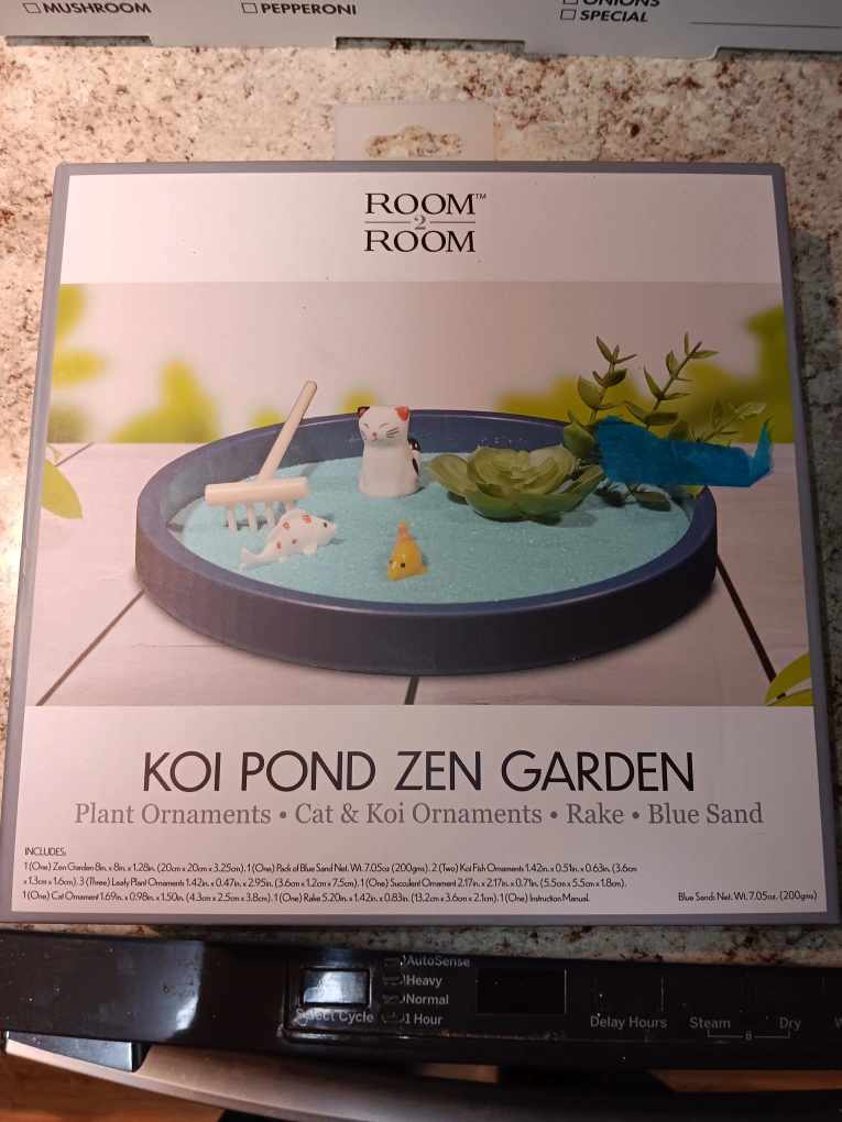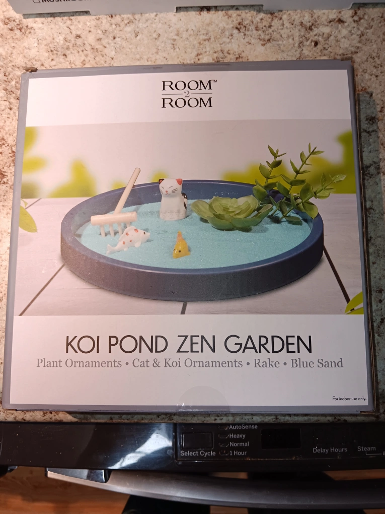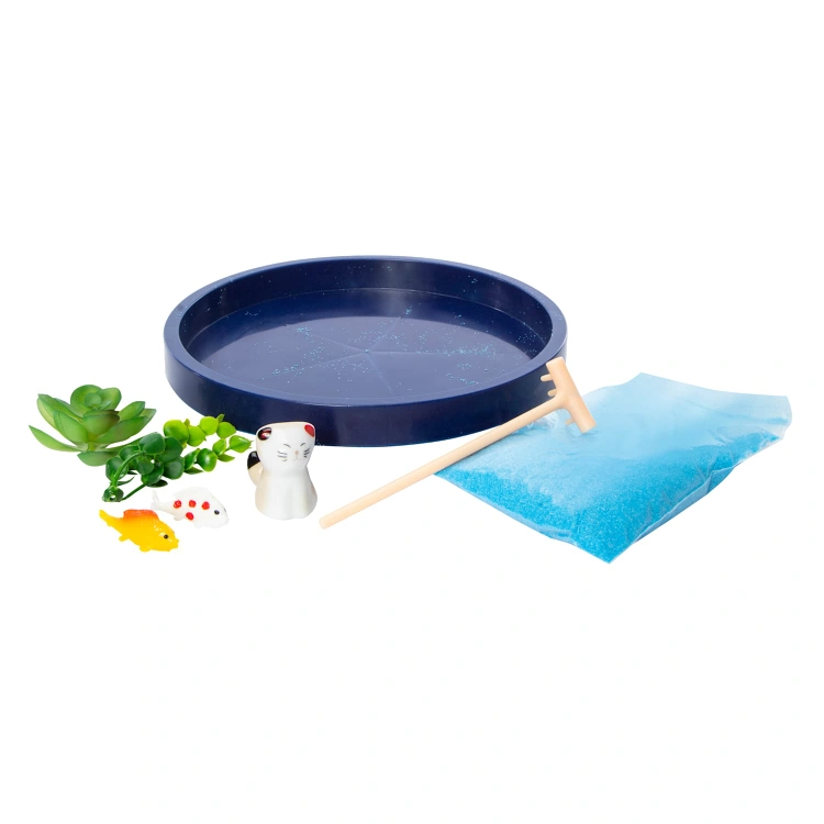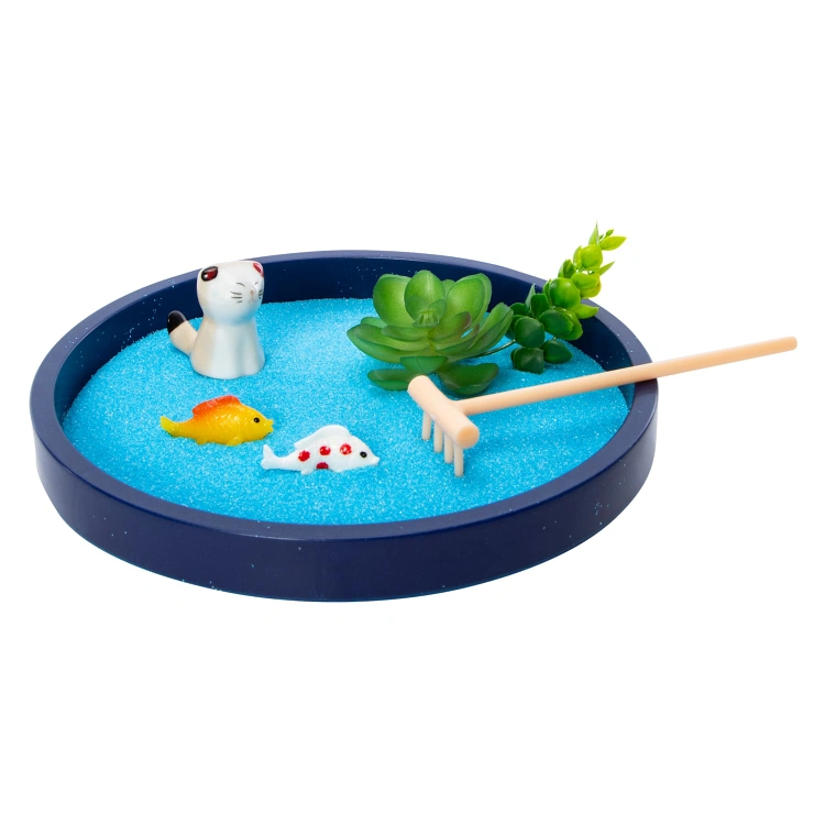 7Miniature zen garden. Includes blue sand, rake, cat and koi figurines, and small plants. Perfect for a desk or tabletop.