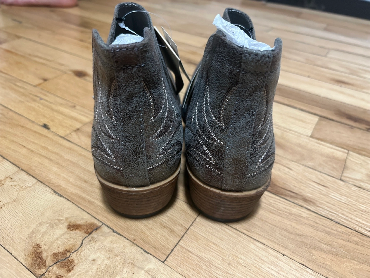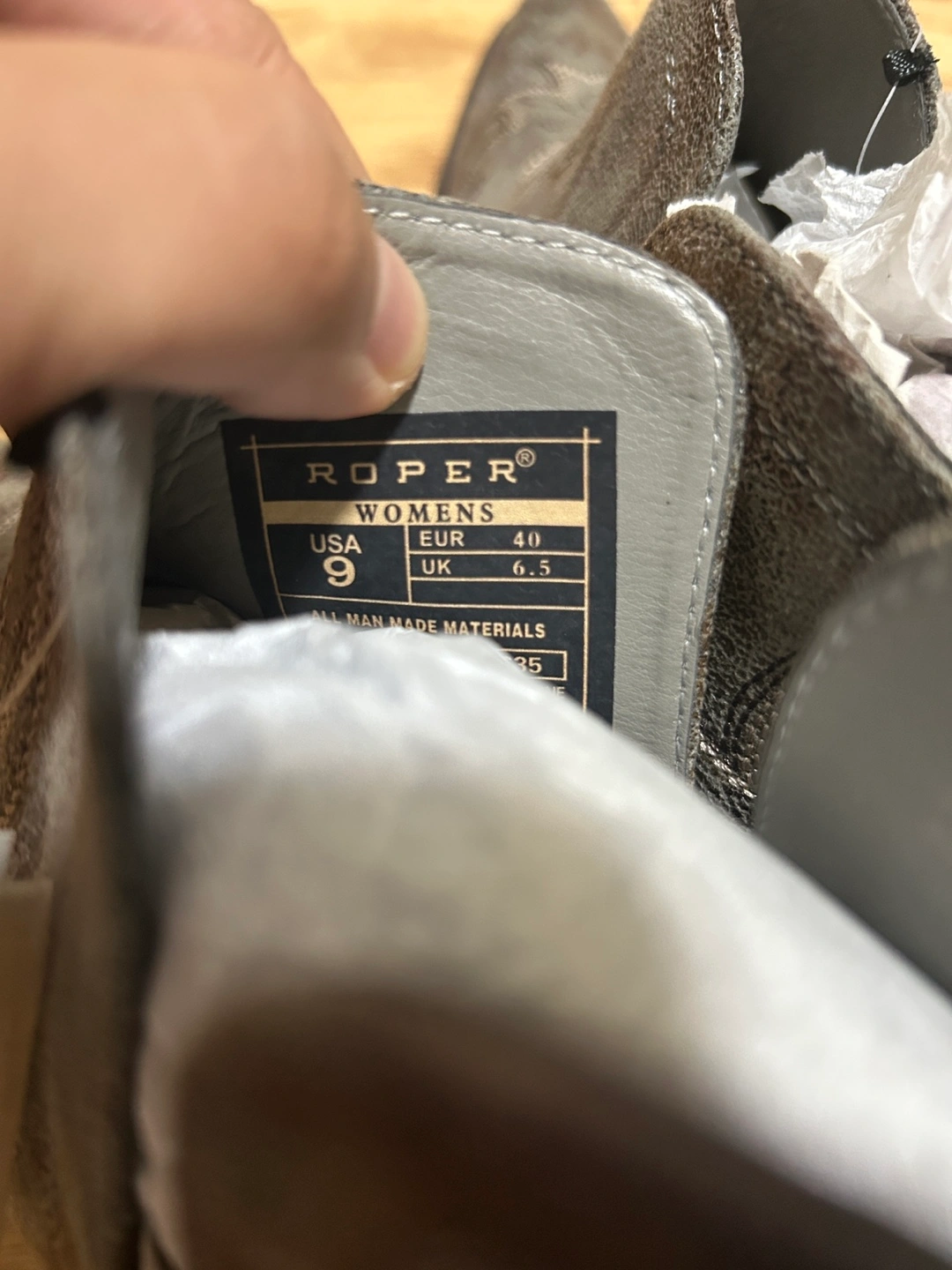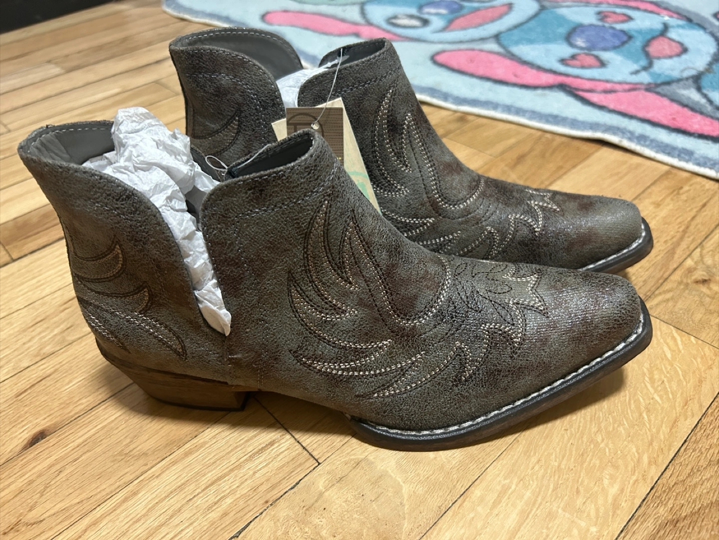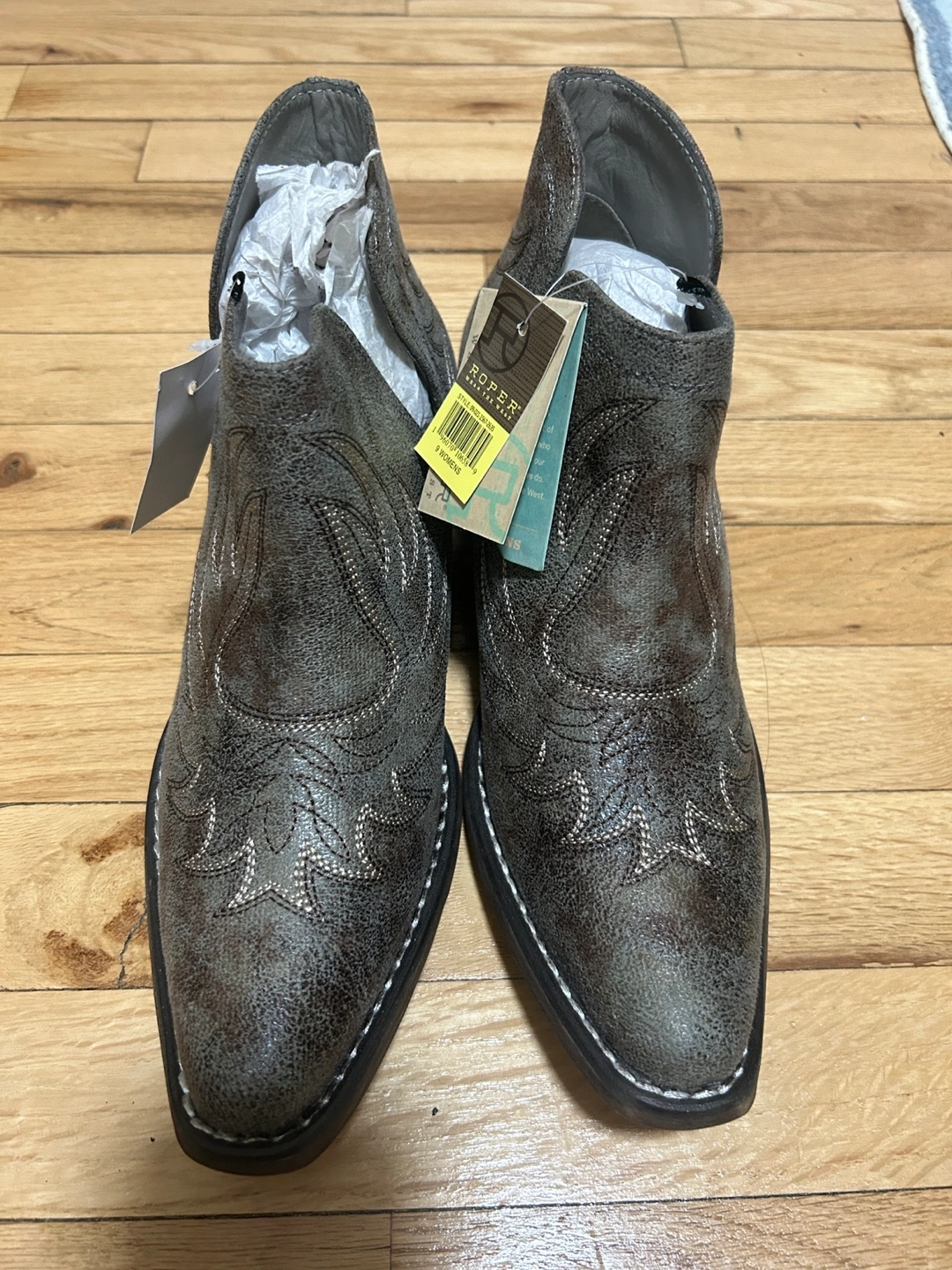 167Selling a brand new pair of Roper women's ankle boots in US size 9. They feature a stylish design with decorative stitching. These boots are made with quality materials and have a comfortable fit. Perfect for adding a touch of western flair to your wardrobe!