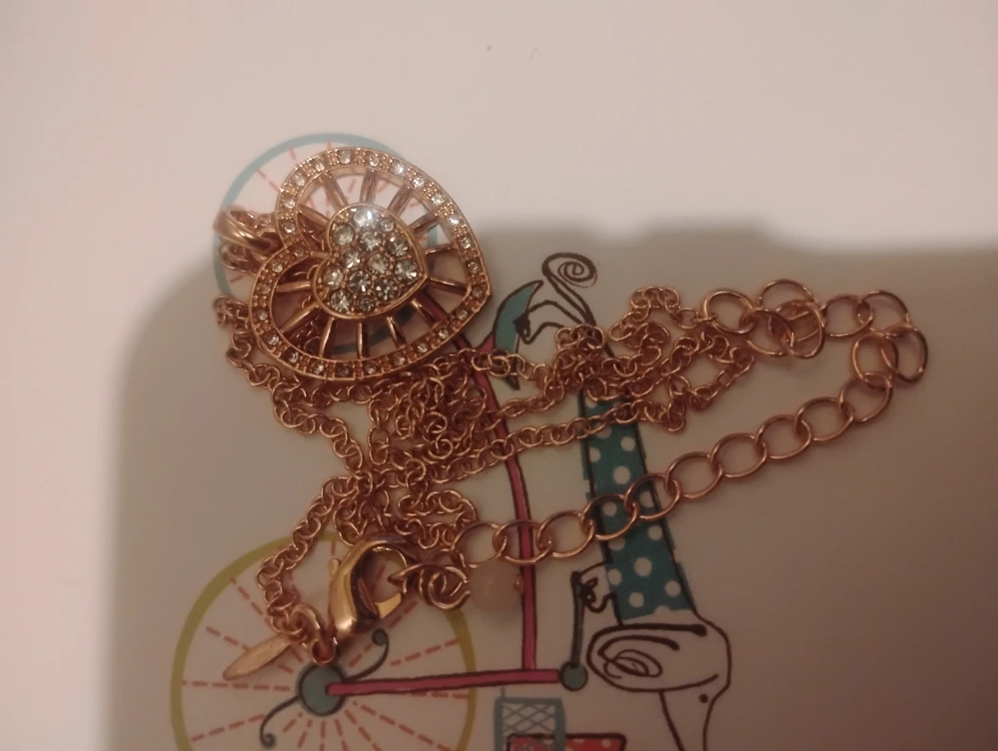 0Selling a cute rose gold-colored necklace with a heart pendant. The heart is decorated with small, shiny stones. It's in great condition and ready to add a touch of sparkle to your outfit