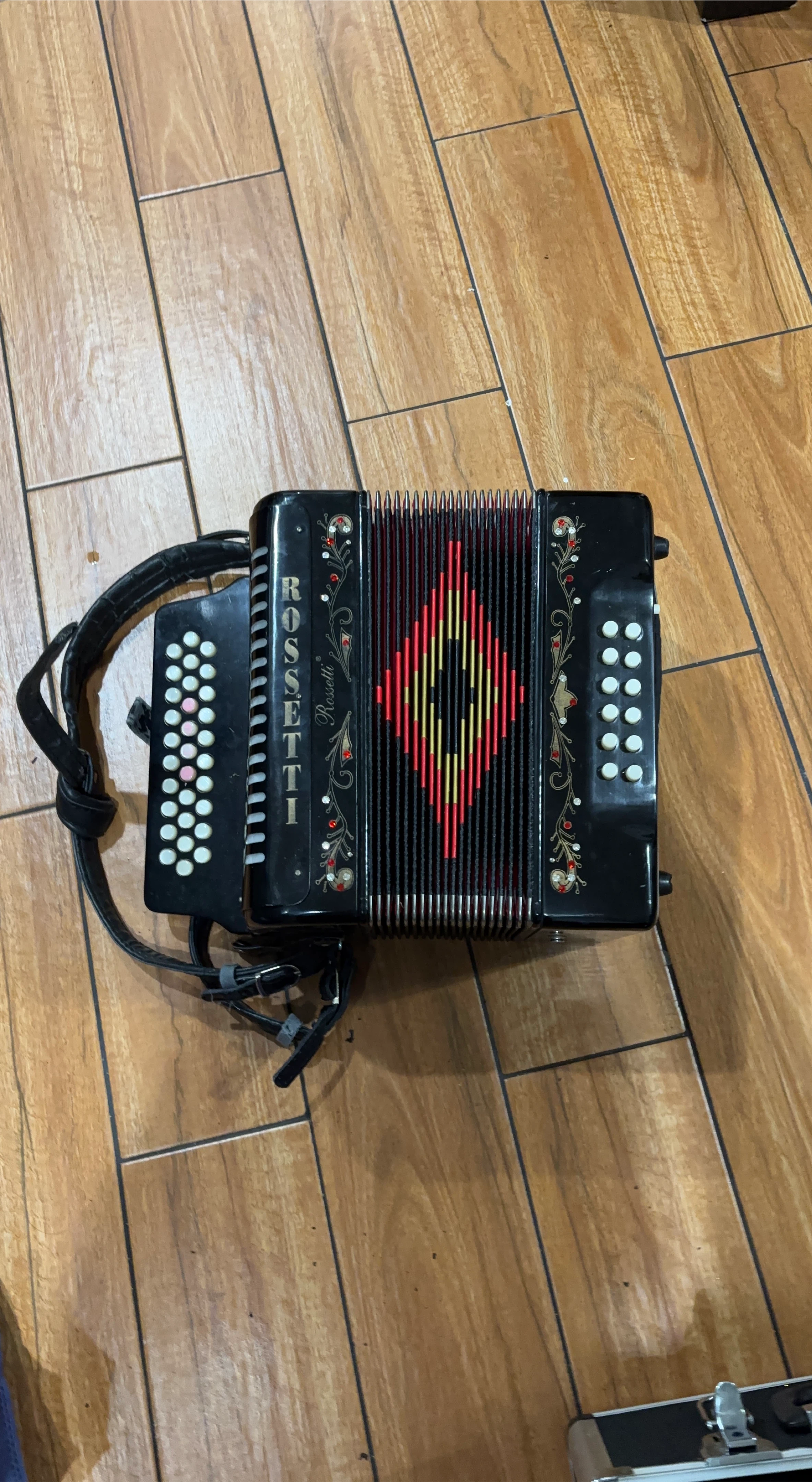 10Selling a gently used Rossetti accordion. It's black with decorative floral accents and a red and gold design on the bellows. Comes with a strap for easy playing!