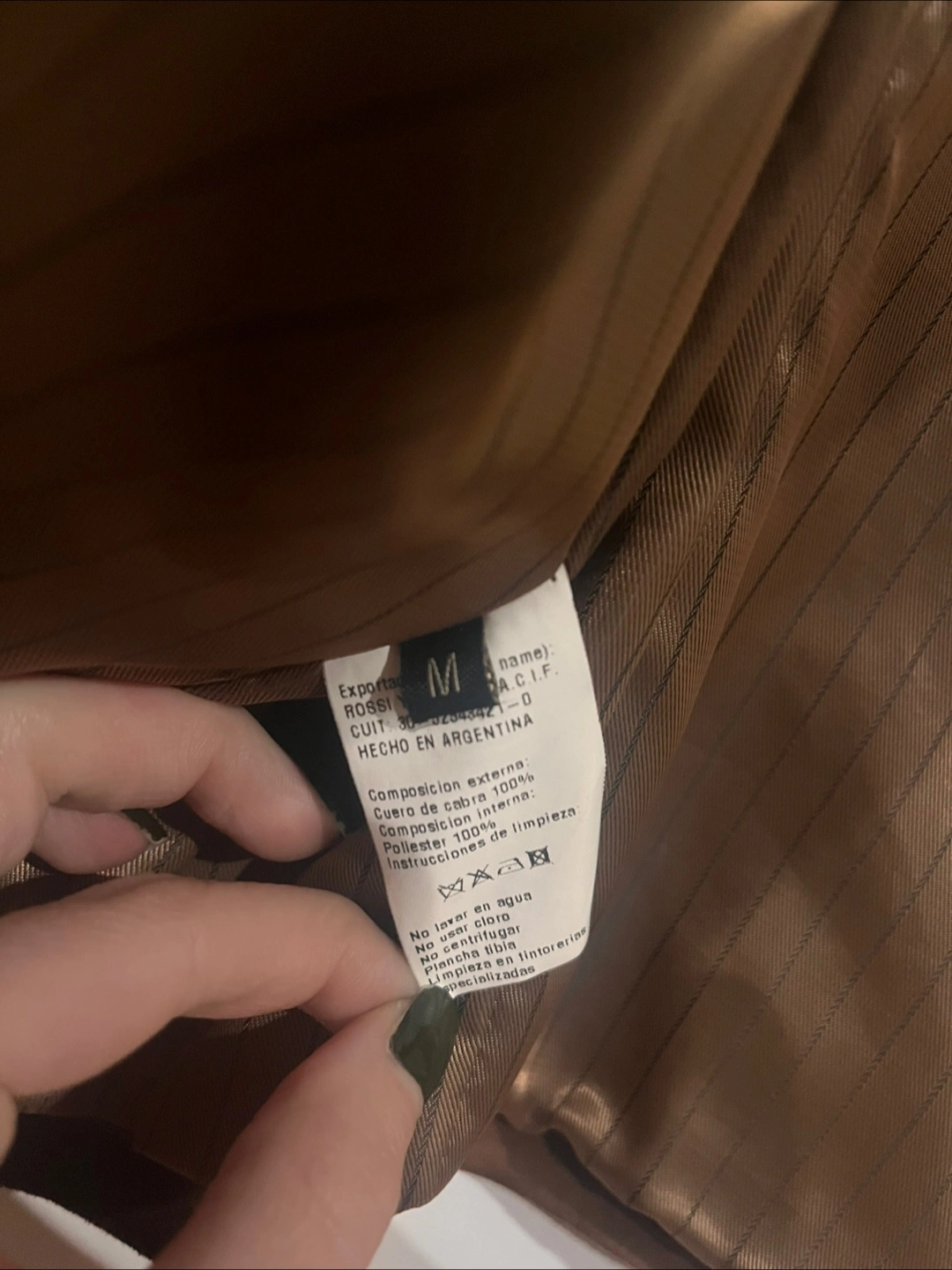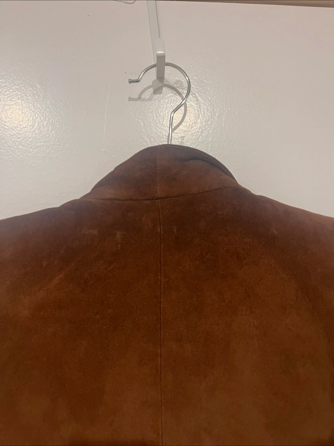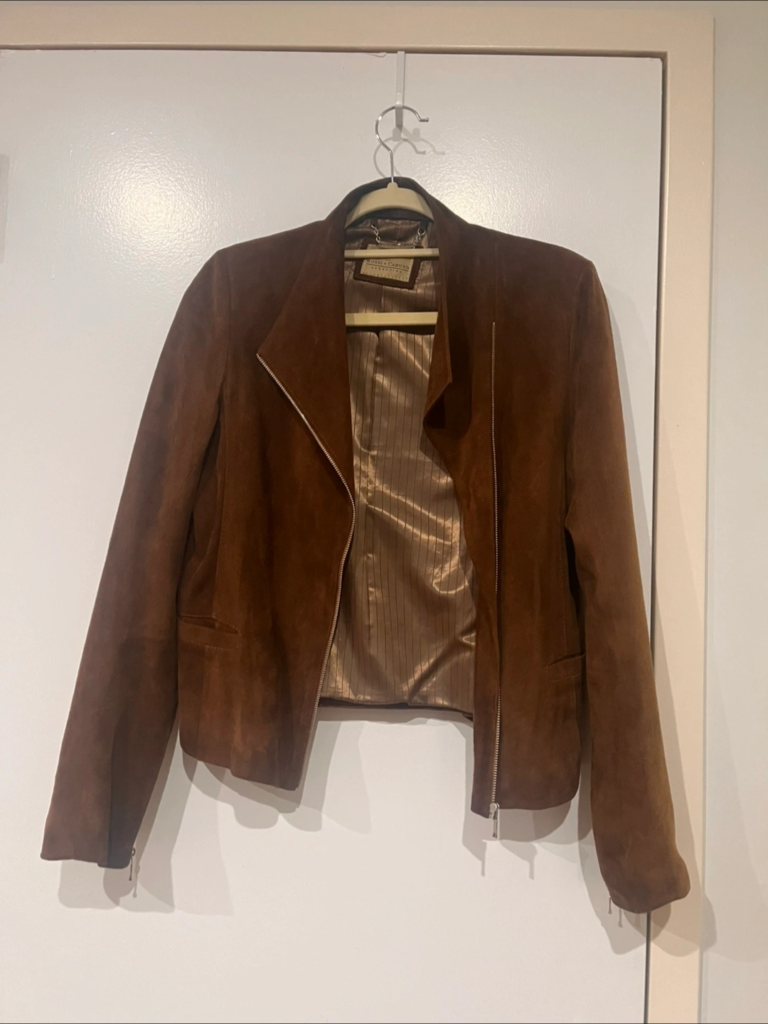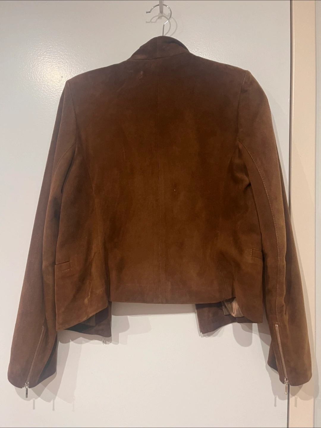 65Brown suede jacket. Asymmetrical zipper. Cuff zipper detail. Cropped, slim fit. Size Medium. Made in Argentina. 100% leather exterior. 100% polyester lining.