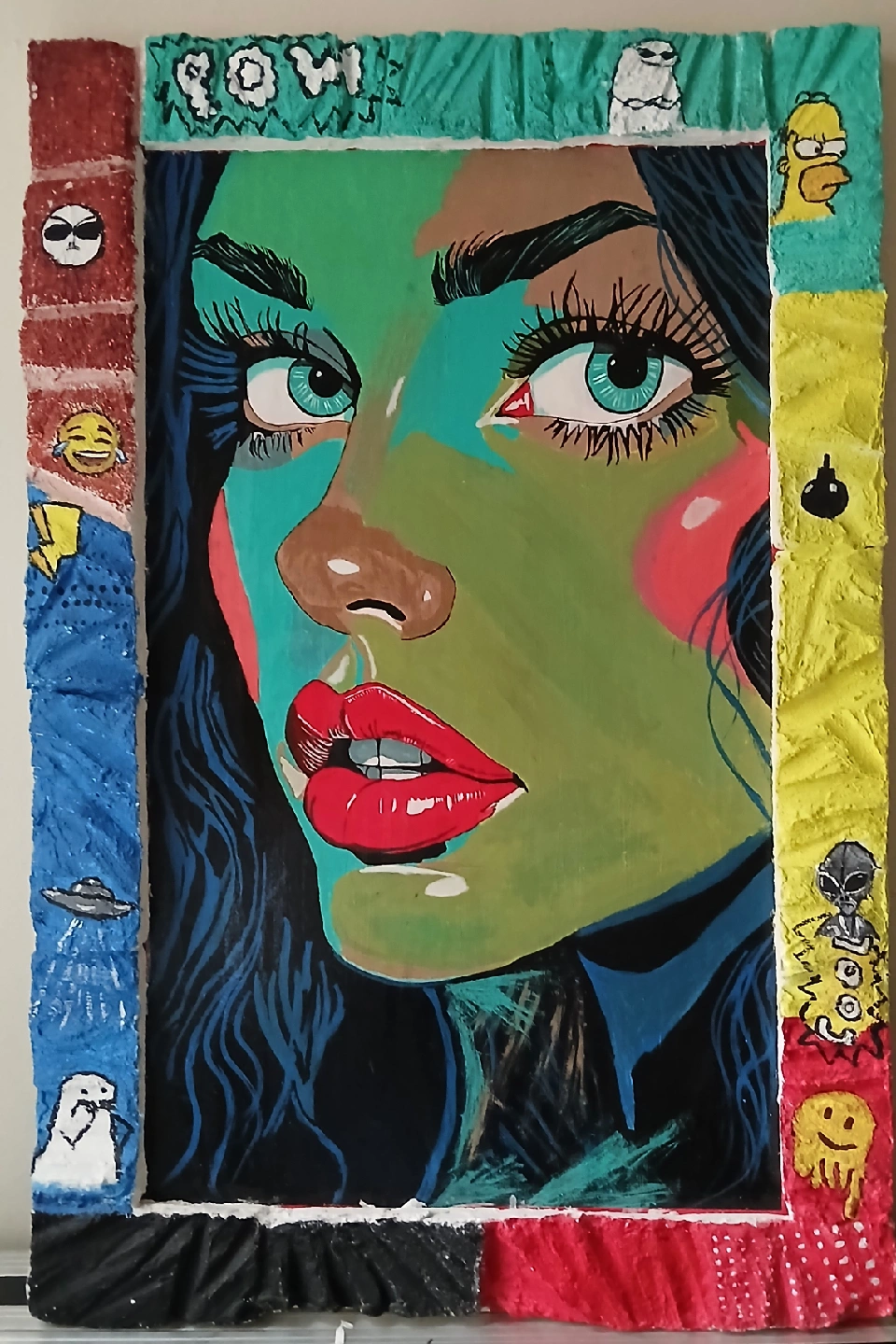 15rostro de mujer colorido y atractivo, arte estilo pop marcó estilo relieve de roca con varias figuras decorativos ancho 19 7/8 por 30 pulgadas de altura
