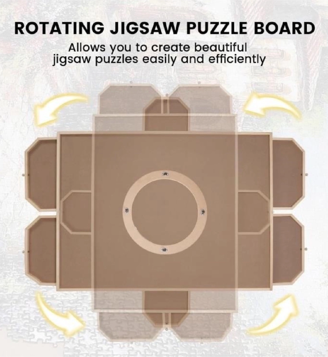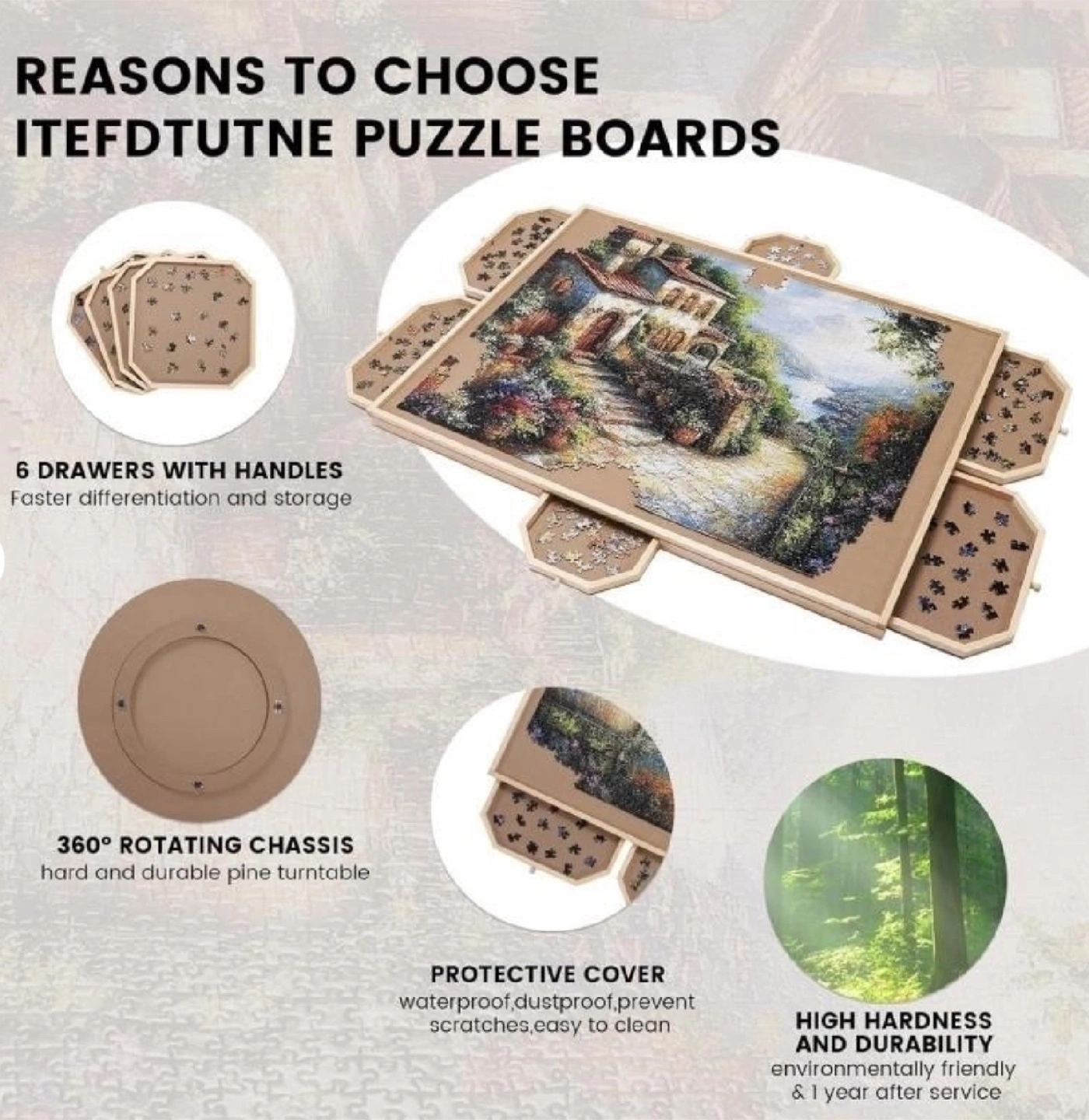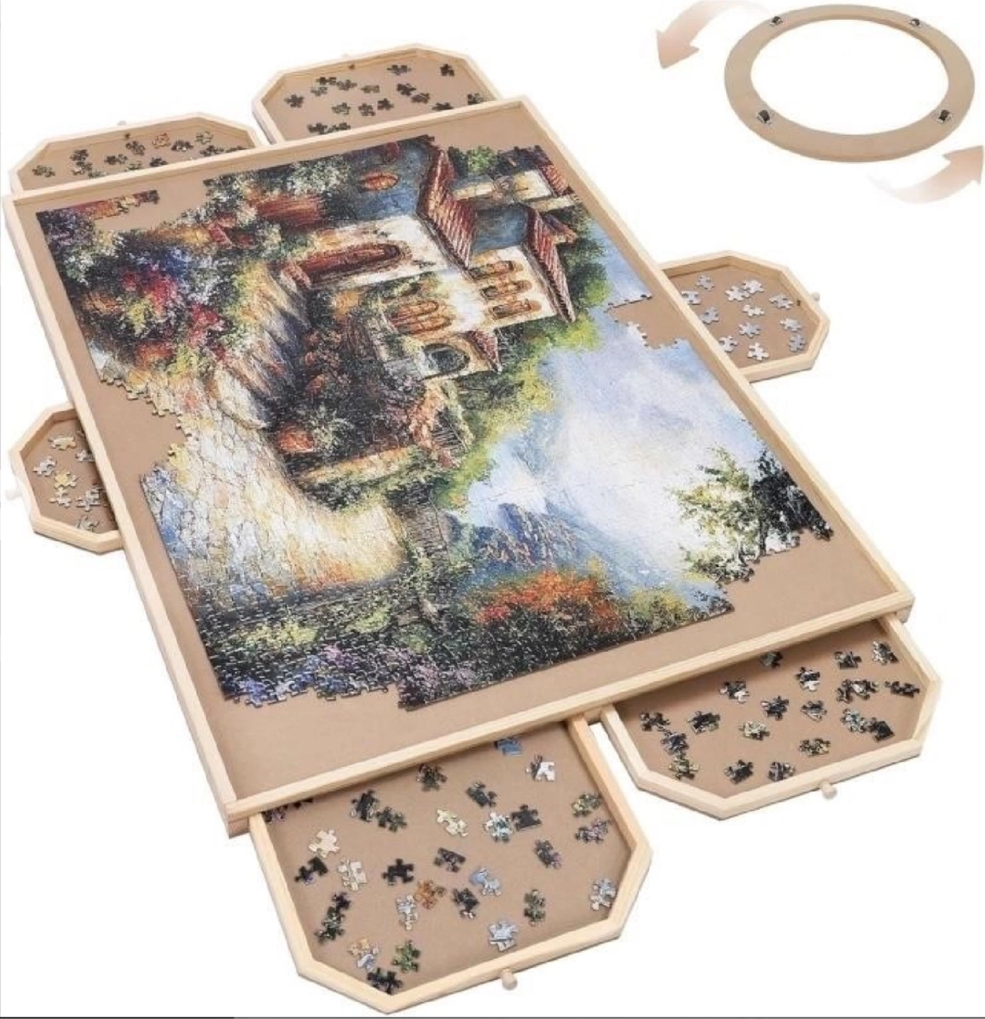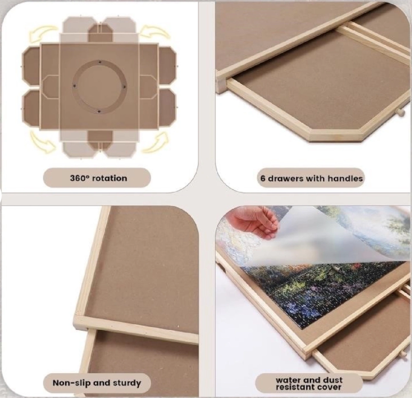 73This rotating jigsaw puzzle board is perfect for puzzle enthusiasts! It features: - 6 drawers with handles for easy storage and differentiation - A 360 ° rotating chassis made of hard and durable pine - A water and dust resistant cover to prevent scratches and keep your puzzle clean - Non-slip and sturdy design