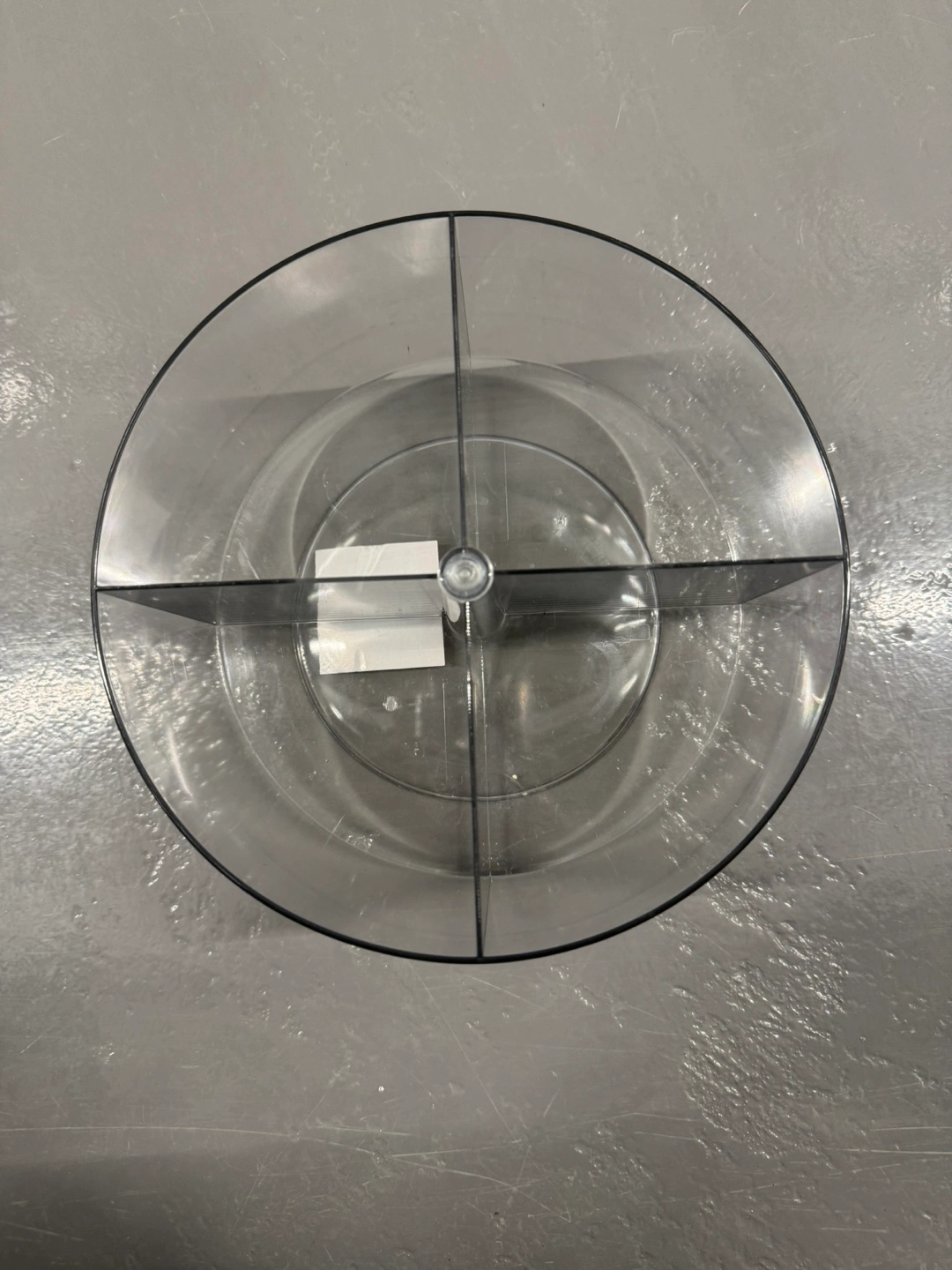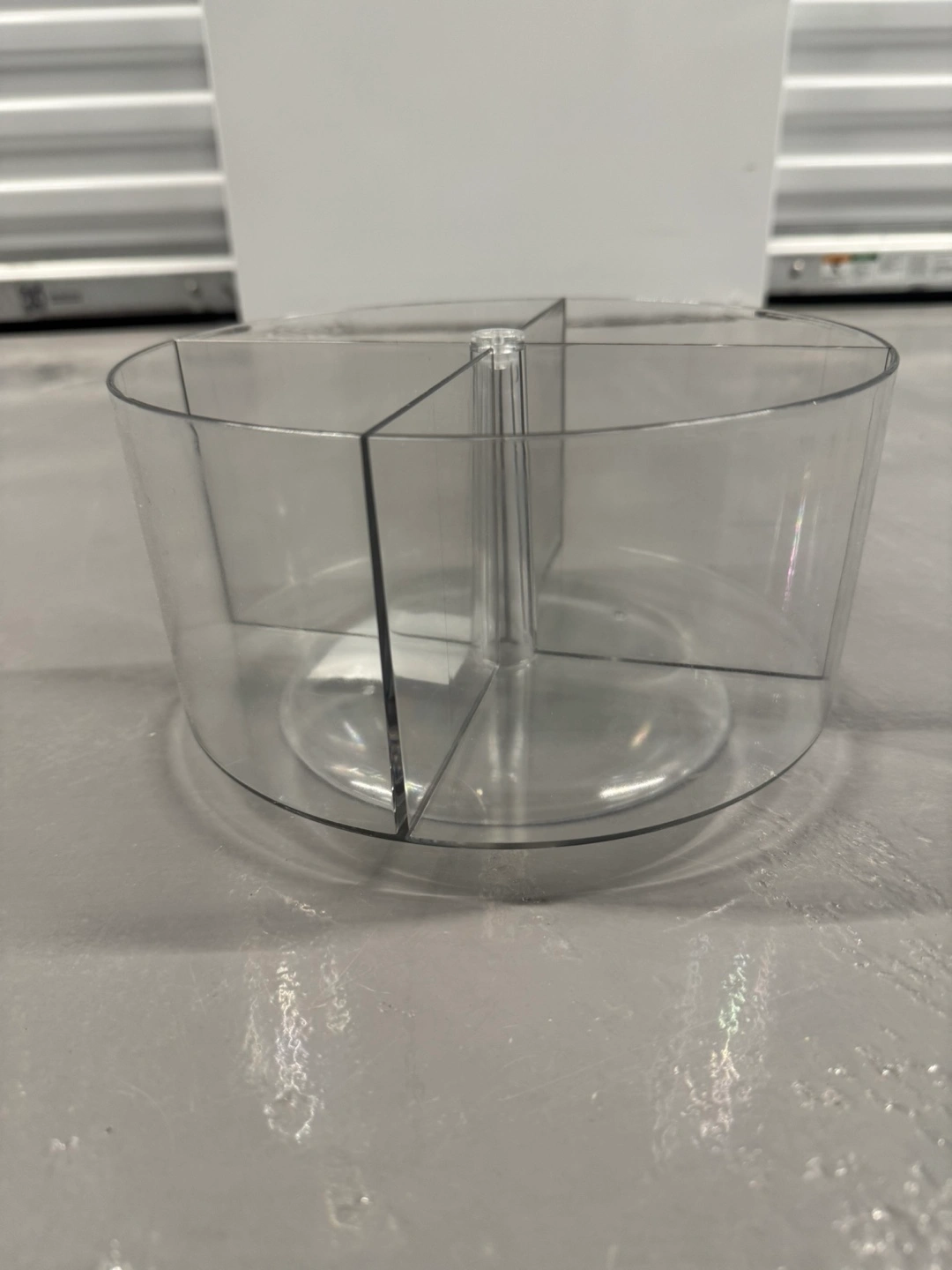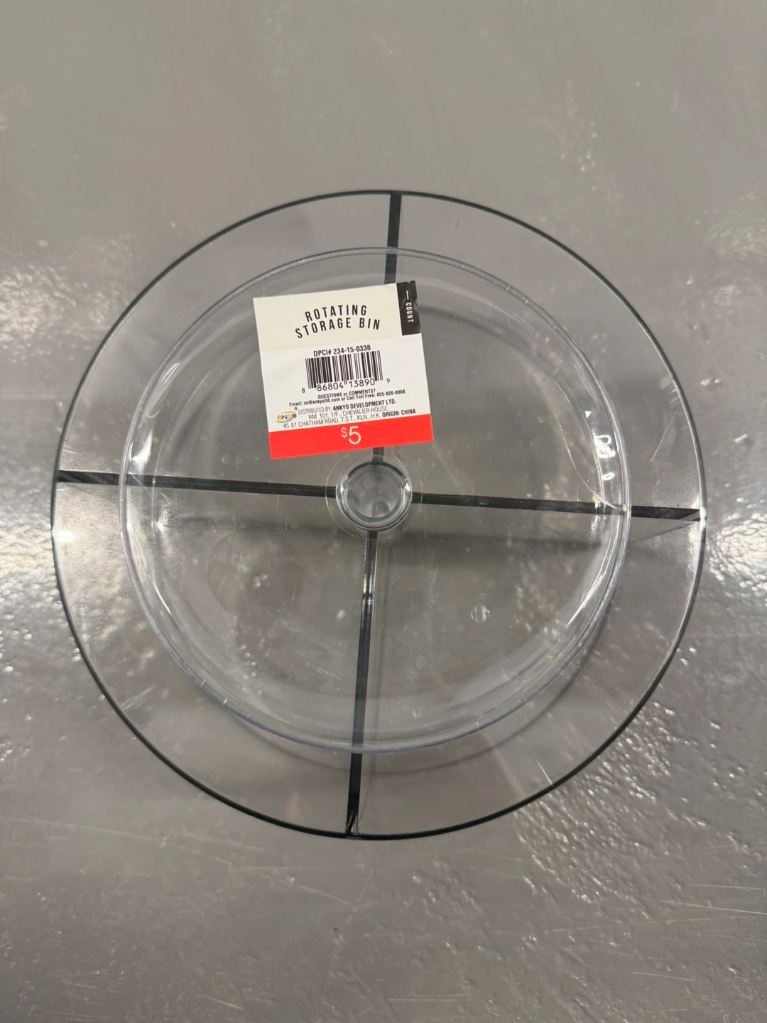 16Clear plastic rotating storage bin. Four divided sections. Great for organizing small items. Perfect for desk, bathroom, vanity section, or craft room.