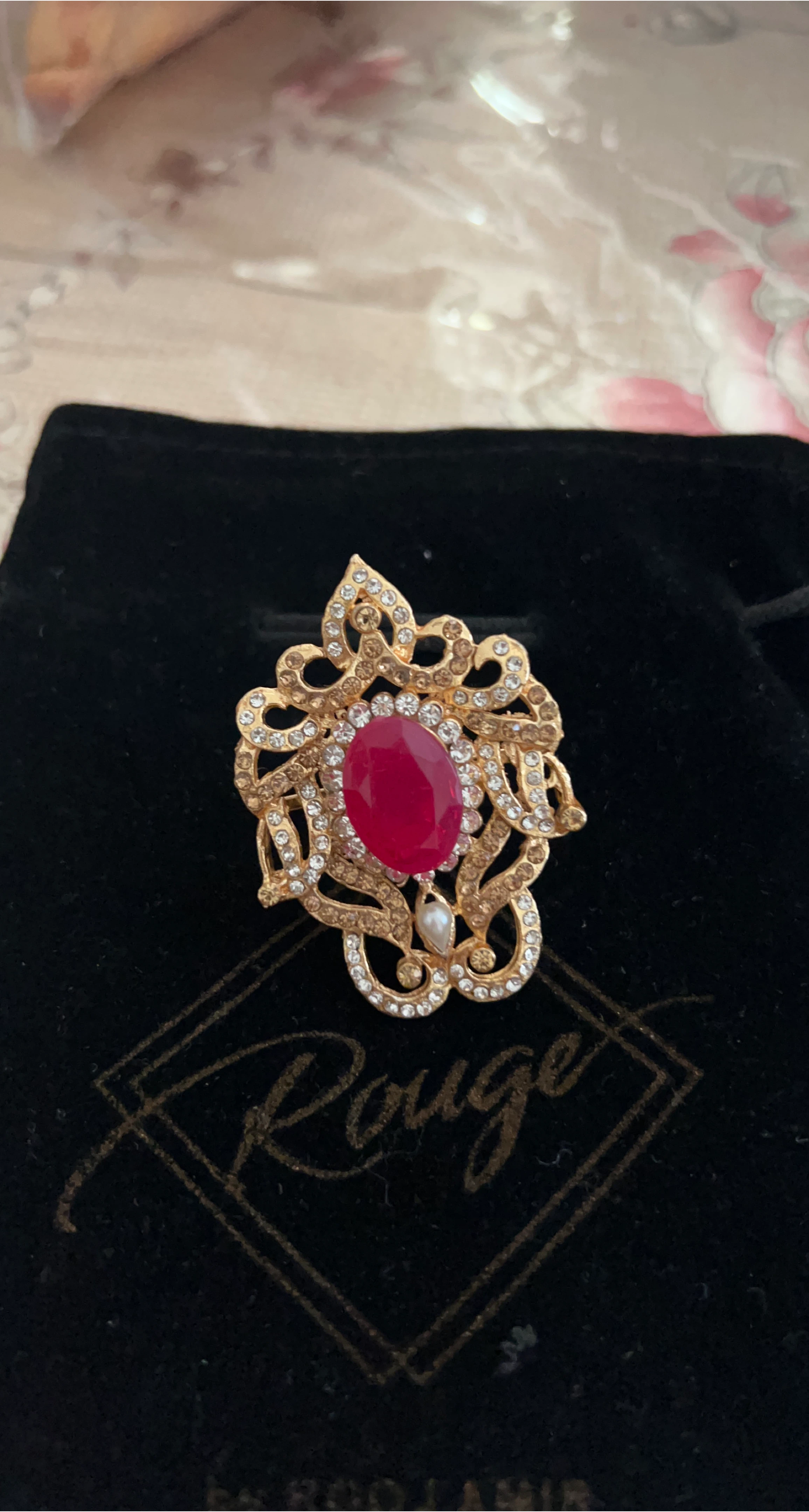 65Selling a beautiful gold-colored ring with a large red stone and smaller clear stones around it. It comes in a Rouge branded pouch.