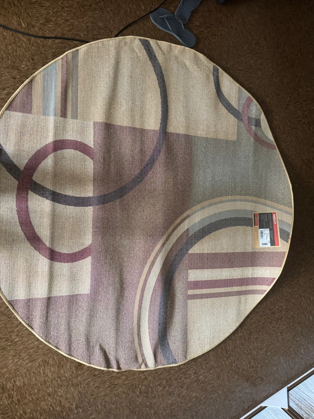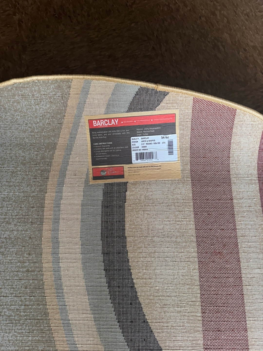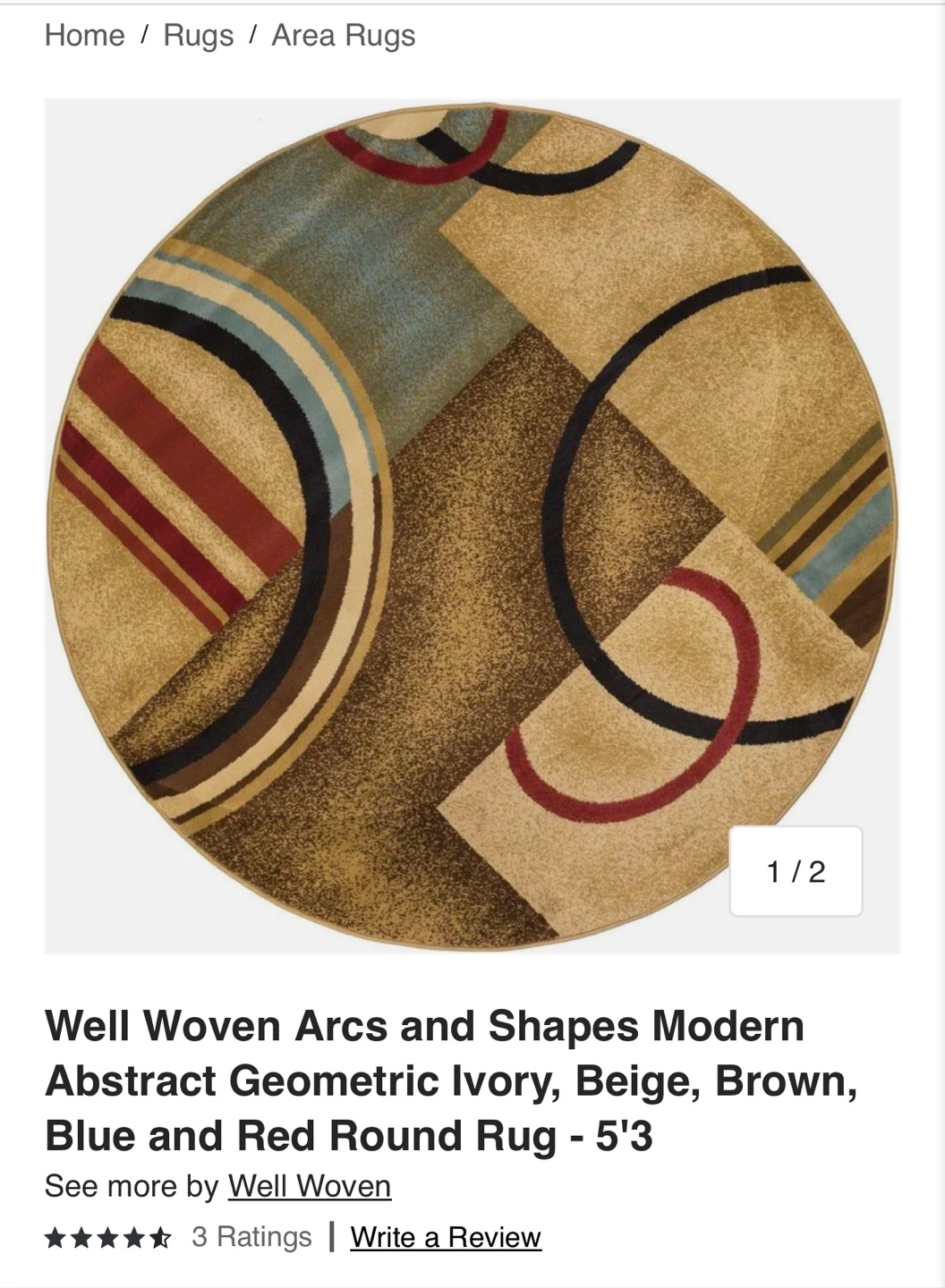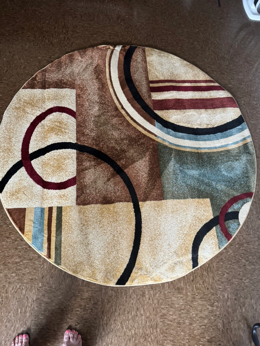 10Round area rug with geometric shapes. The rug features shades of brown, beige, blue, and red. Place it under a coffee table to bring the room together and create a warm and welcoming space.
