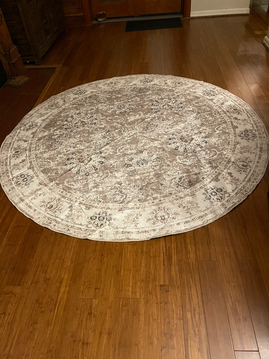 Here's a round area rug that could be a great addition to your home. It features a neutral color palette with a detailed pattern. Perfect for adding a touch of elegance to any room
