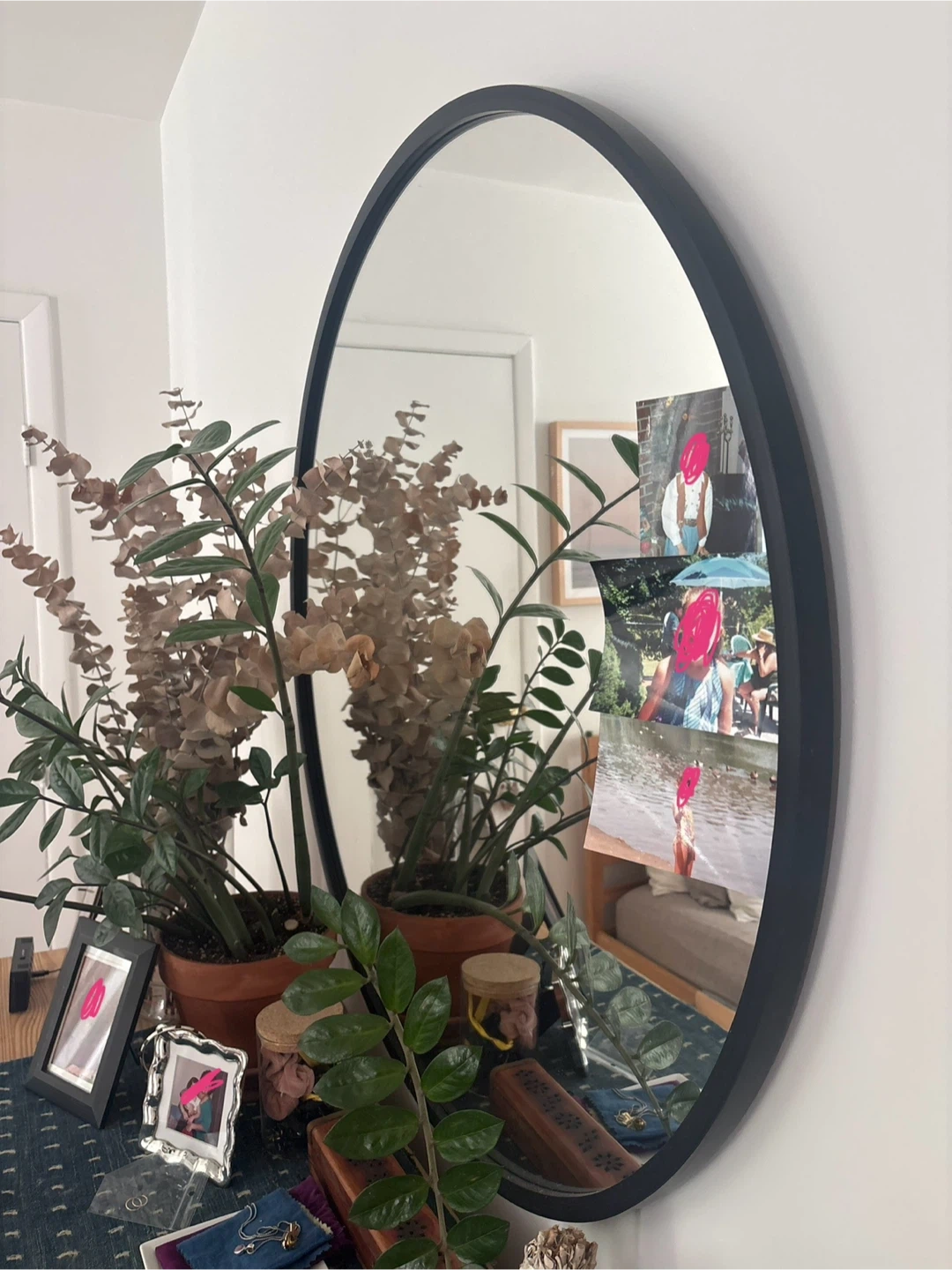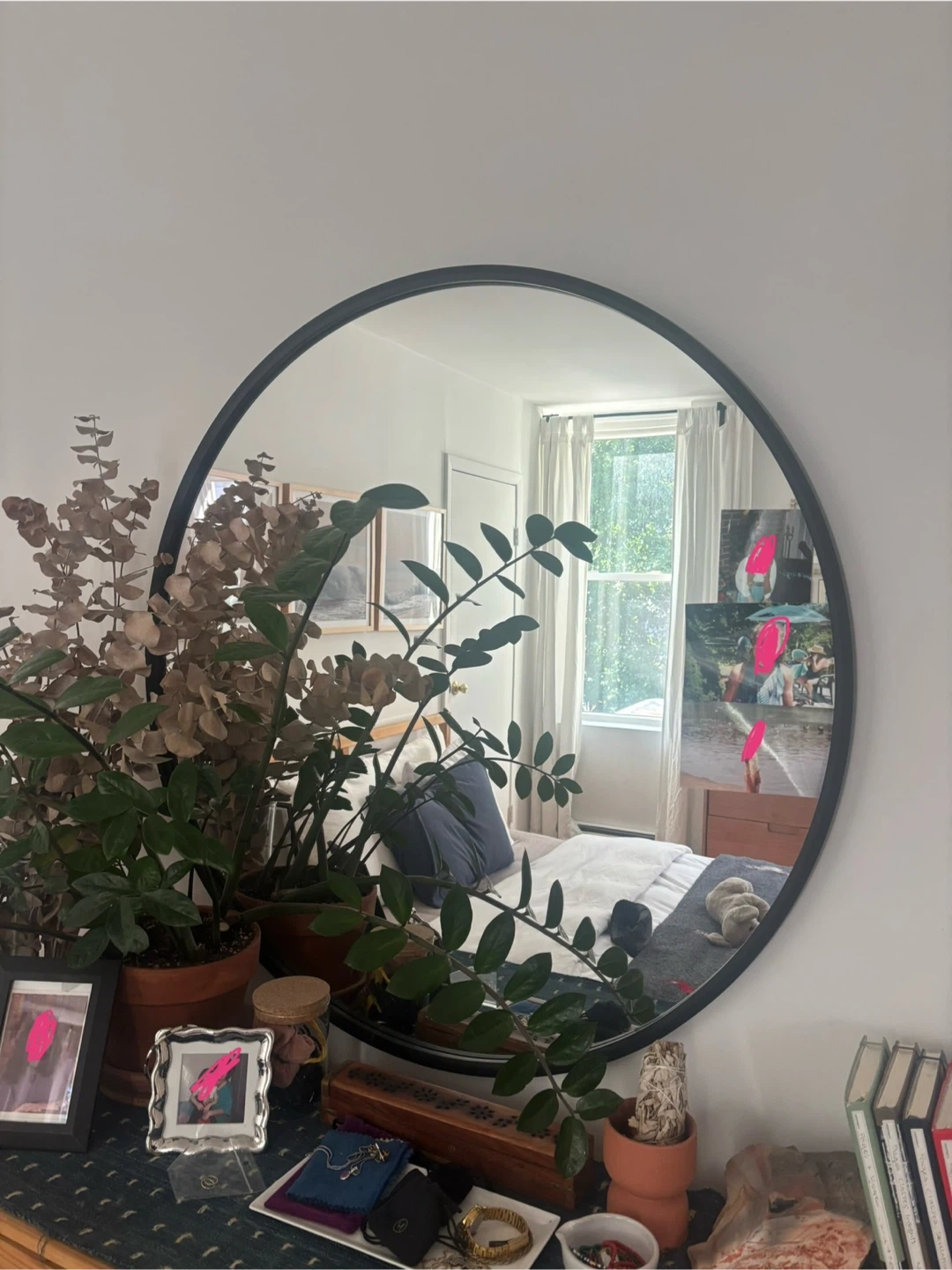 Selling a round mirror with a black frame. It's in great condition and would look lovely in any room of your house. I think it’s nice for bedroom or entryway. 32 inches across