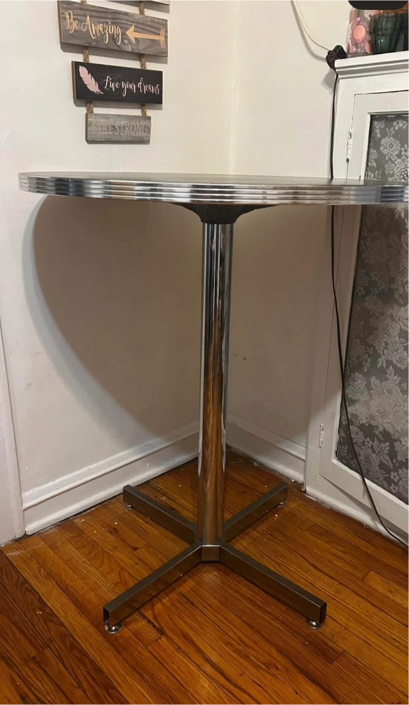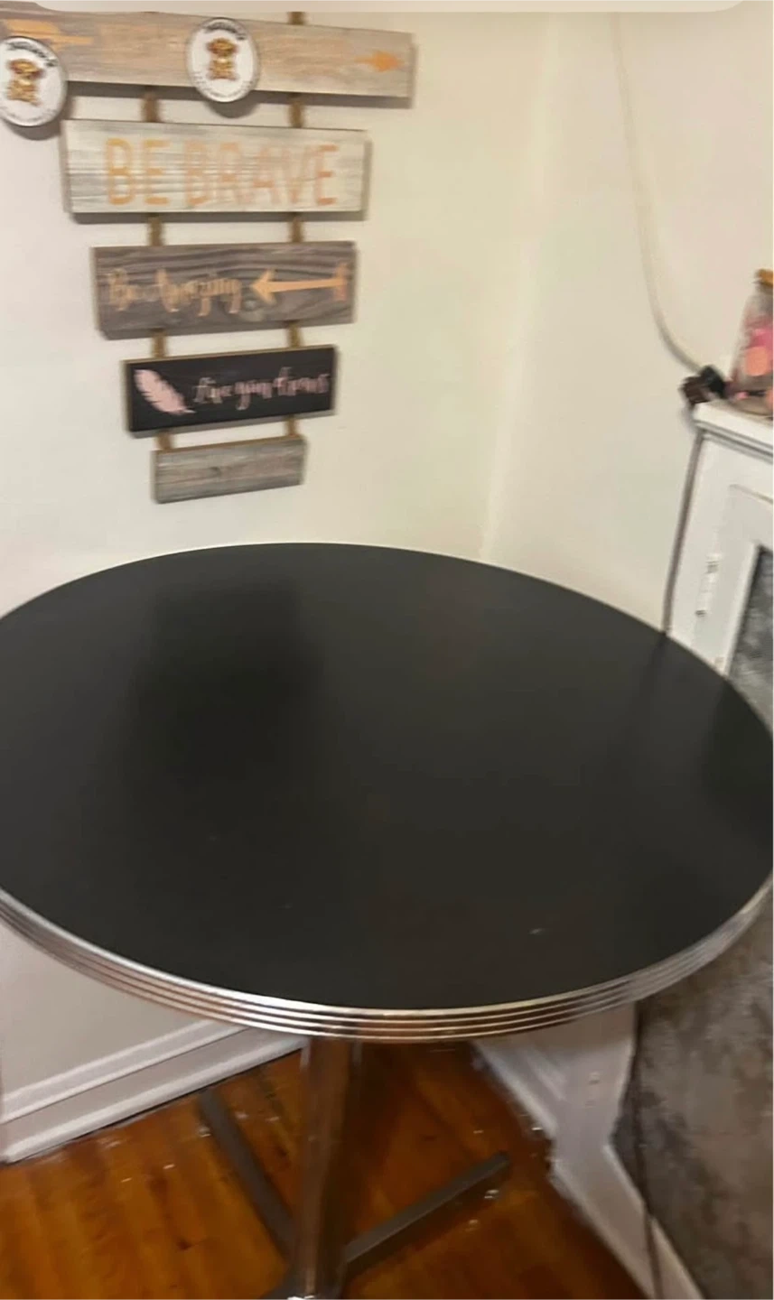 Selling a round dining table with a black top and a chrome base. It's in good condition and would be perfect for a small dining area or kitchen