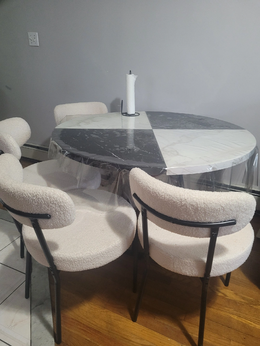 Selling a round dining table with four cream boucle chairs. The table has a unique black and white marble-like design. The chairs are super comfy with a soft, textured boucle fabric and sleek black metal legs. Perfect for a cozy dining space!