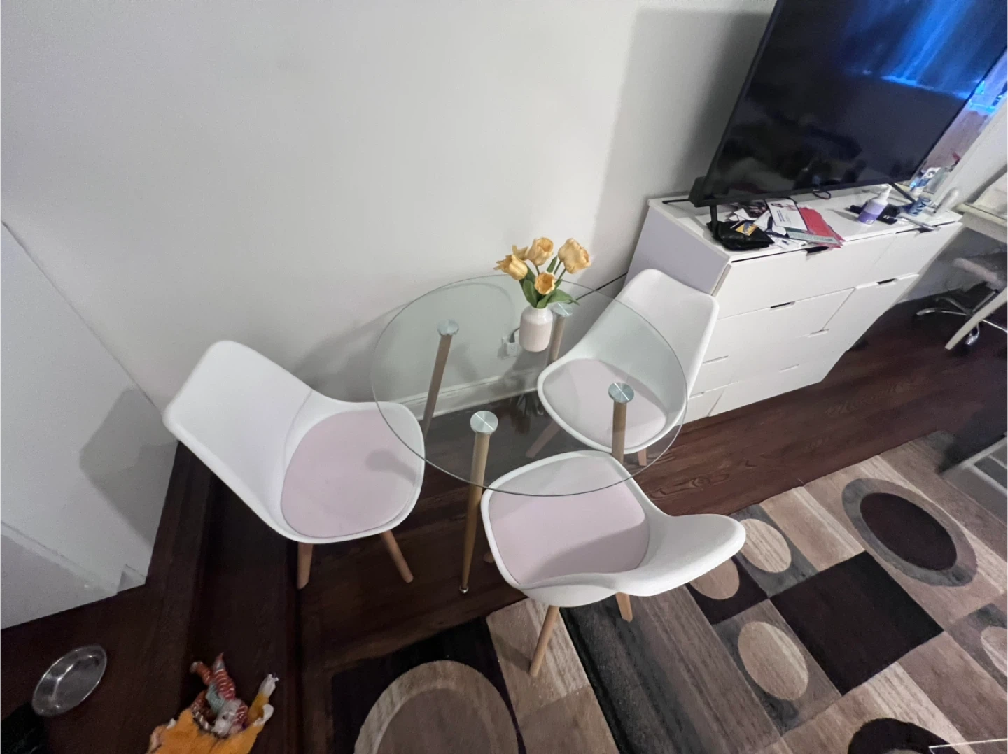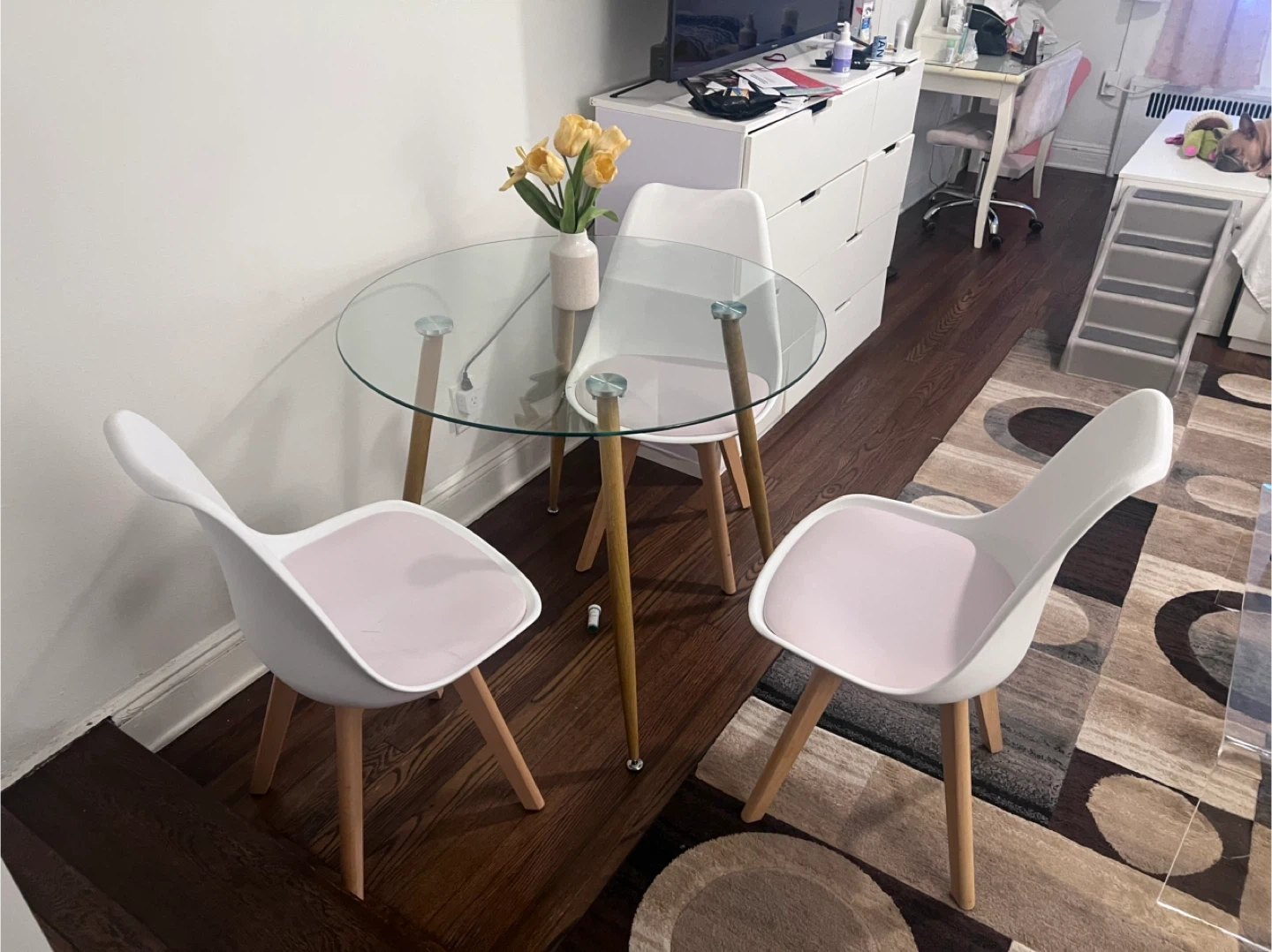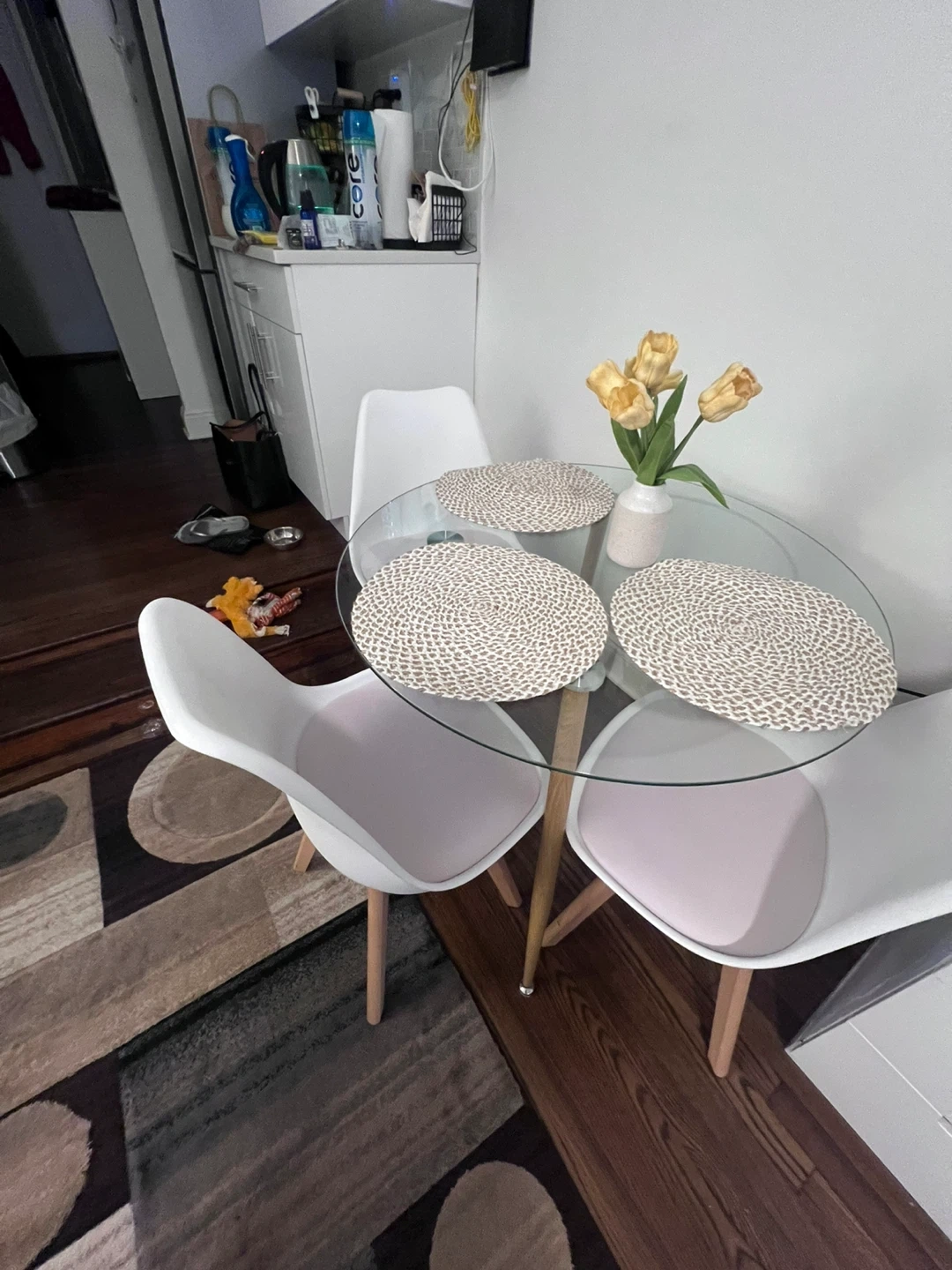 75Selling a round glass dining table with four white chairs. The chairs have wooden legs and a padded seat. Perfect for a small dining area or kitchen nook! Measuring 35' Moving from NYC and selling everything, 56th street between 2nd and 3rd, elevator building in midtown East