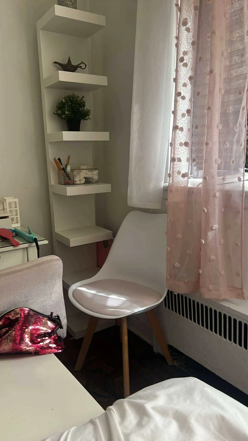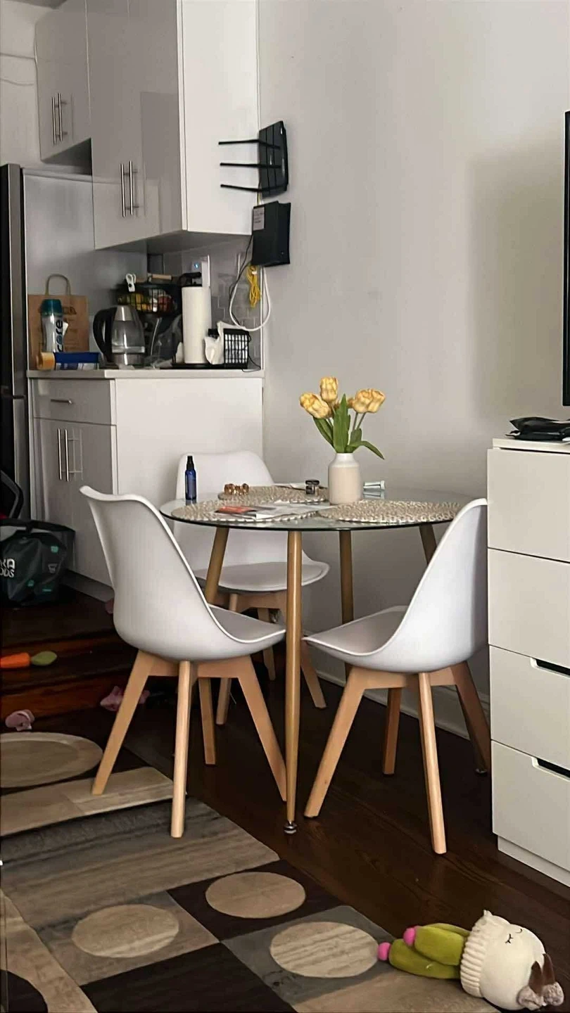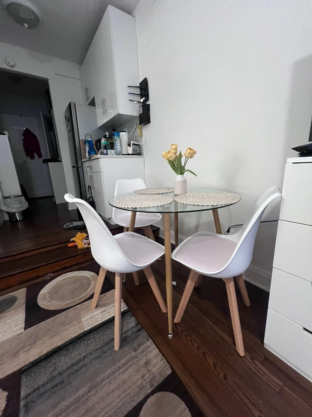 75Selling a round glass dining table with four white chairs. The chairs have wooden legs and a padded seat. Perfect for a small dining area or kitchen nook! Measuring 35' Moving from NYC and selling everything, 56th street between 2nd and 3rd, elevator building in midtown East