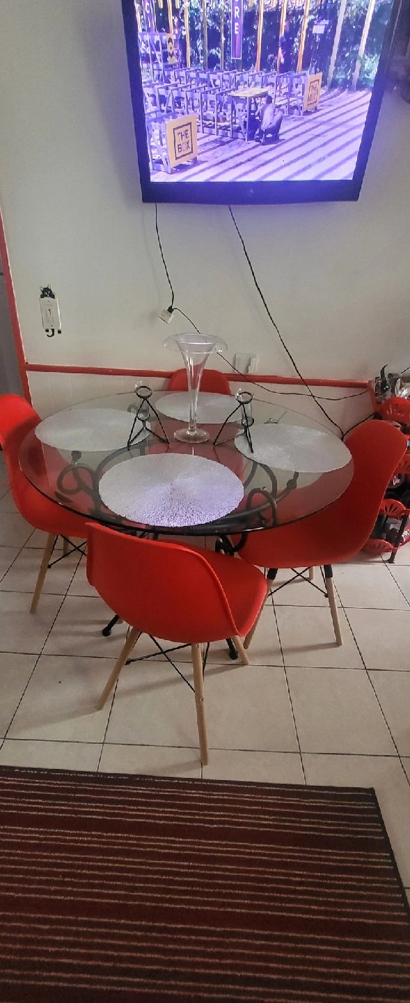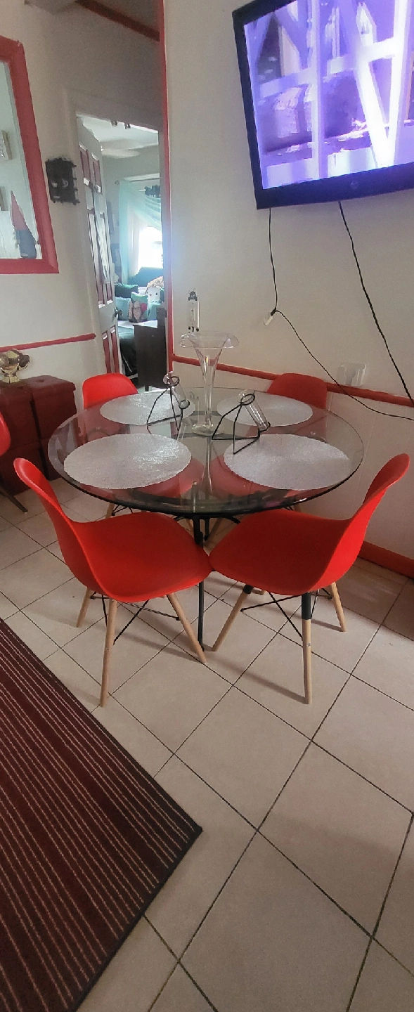 5Selling a round glass dining table paired with four vibrant red chairs. This set would be perfect for a kitchen or dining area. The chairs have a modern design with wooden legs. The table has a black metal frame.