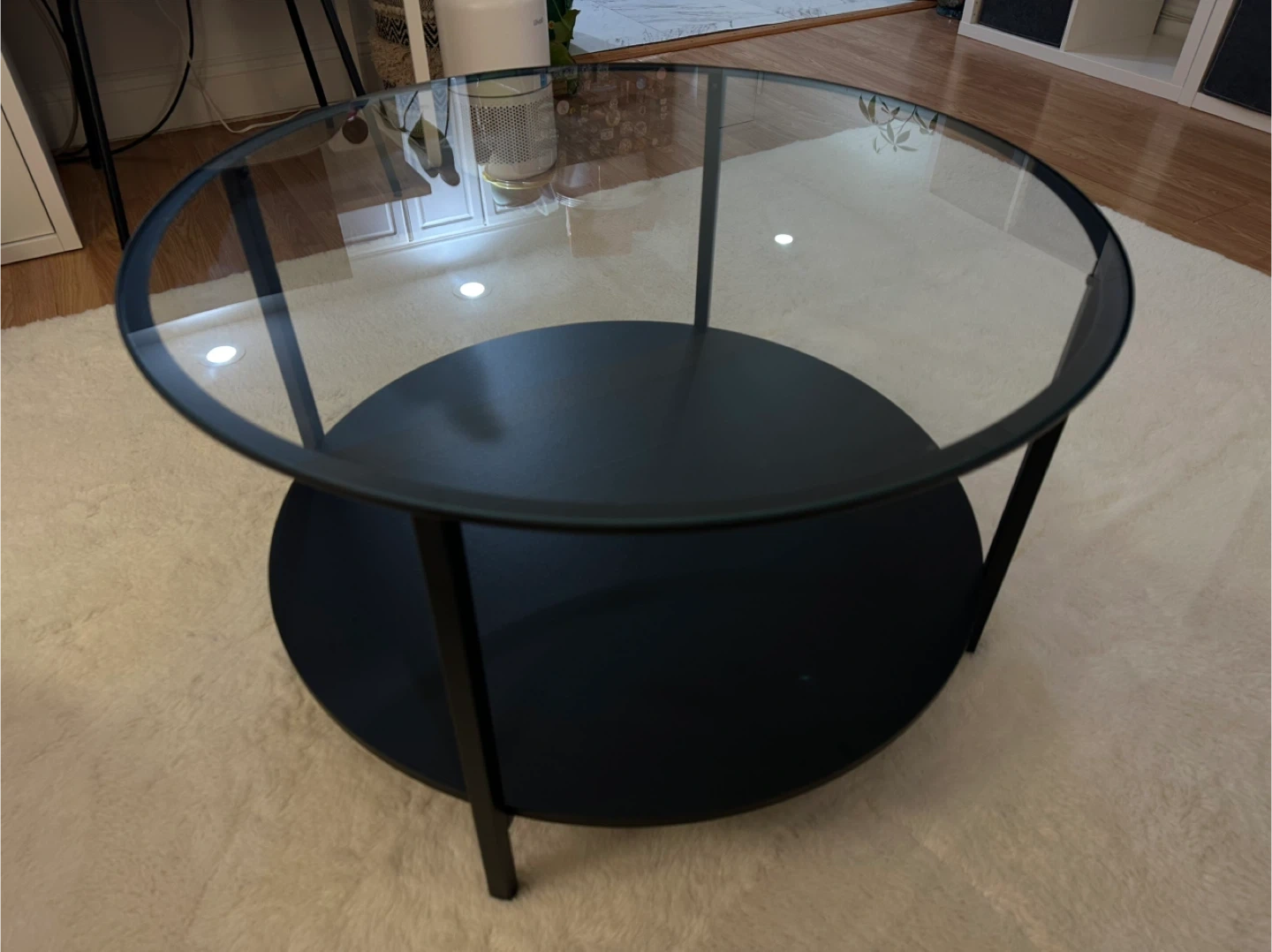 91I'm selling a round coffee table with a glass top and a black frame. It features a sleek, modern design with a lower shelf for storage or display. It's in great condition and would be a stylish addition to any living room!