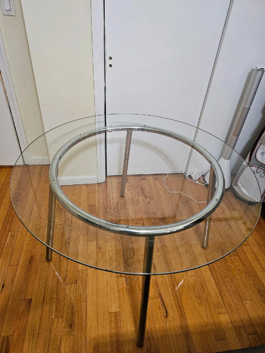 90Selling a round glass top dining table. It has a clear glass top and a silver metal frame. It's in good condition and would be a great addition to any dining room or kitchen cash only pick up please