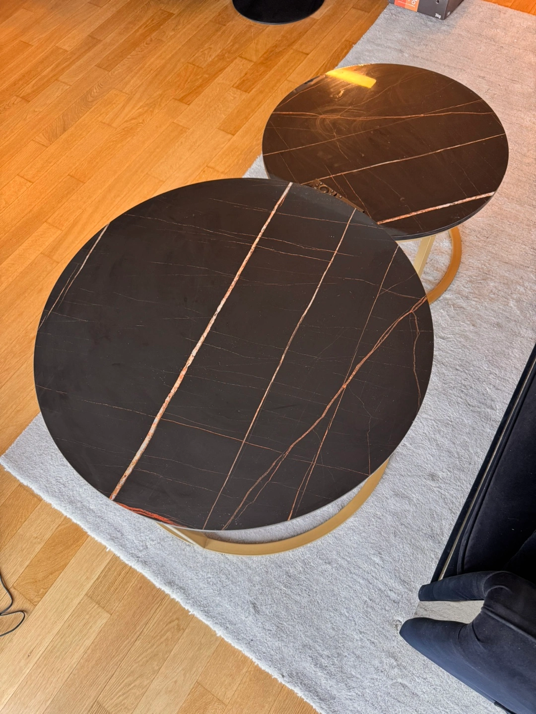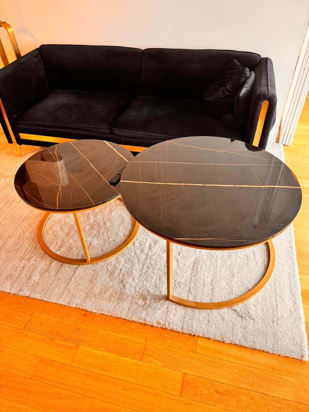 15WiberWi Round Coffee Table Nesting Tables Set of 2, Large : Ø 34.0", Small : Ø 26.0", Modern Design Coffee Tables for Living Room, Gold Metal Frame Circle Cocktail Table, High Glossy Faux Black Marble Two nesting coffee tables. Gold metal base. Black marble tops with gold veining. Modern style. Perfect for living room.