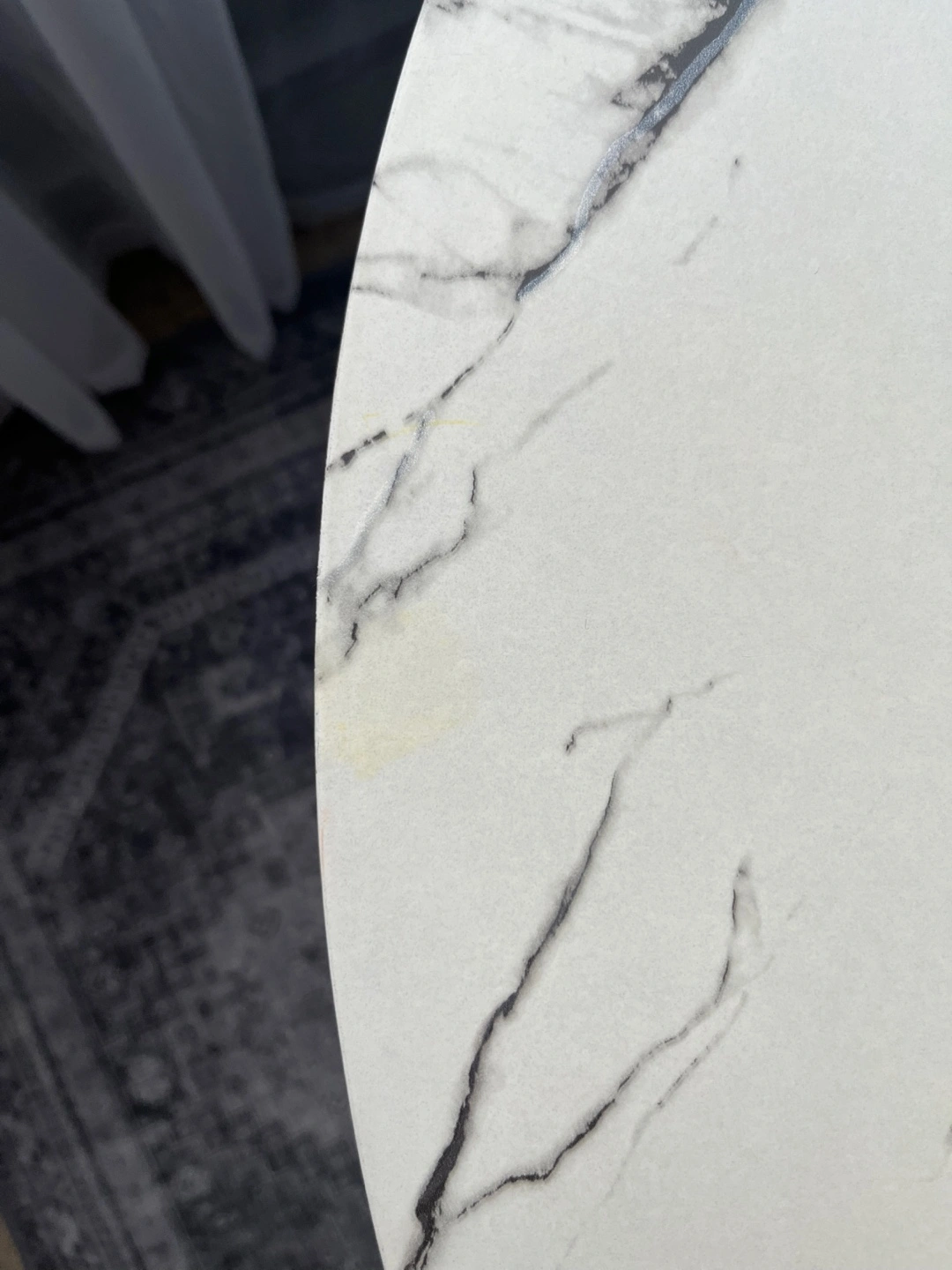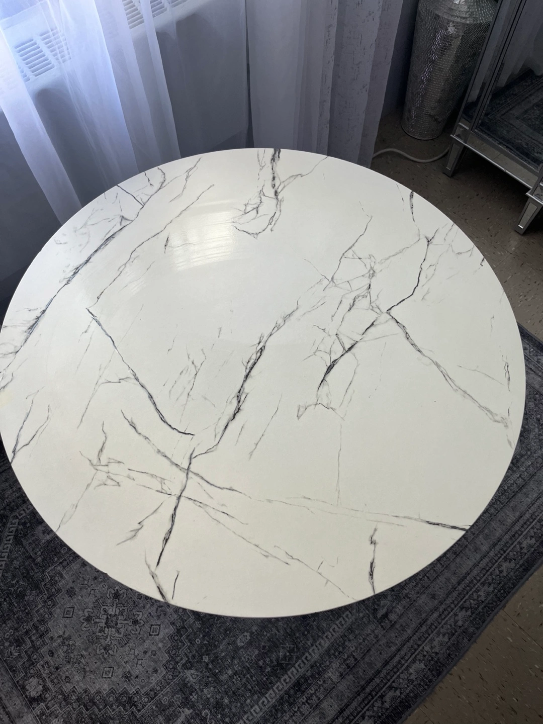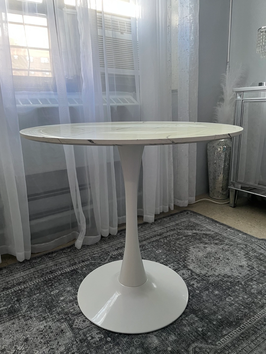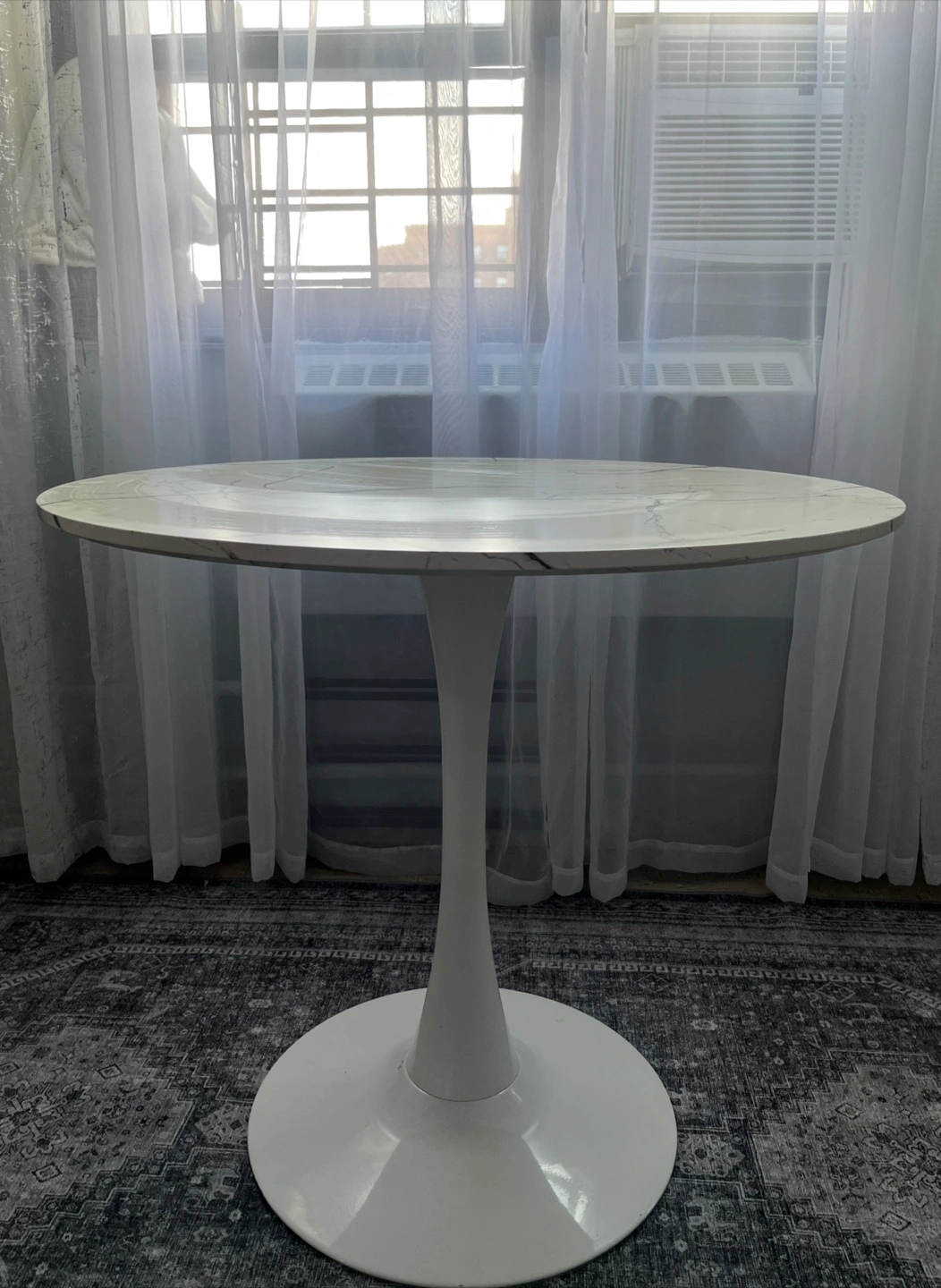 Selling a round tulip table with a faux marble top and a white base. It's a stylish addition to any space! There are some minor signs of wear, but overall it’s in good condition and ready for a new home
