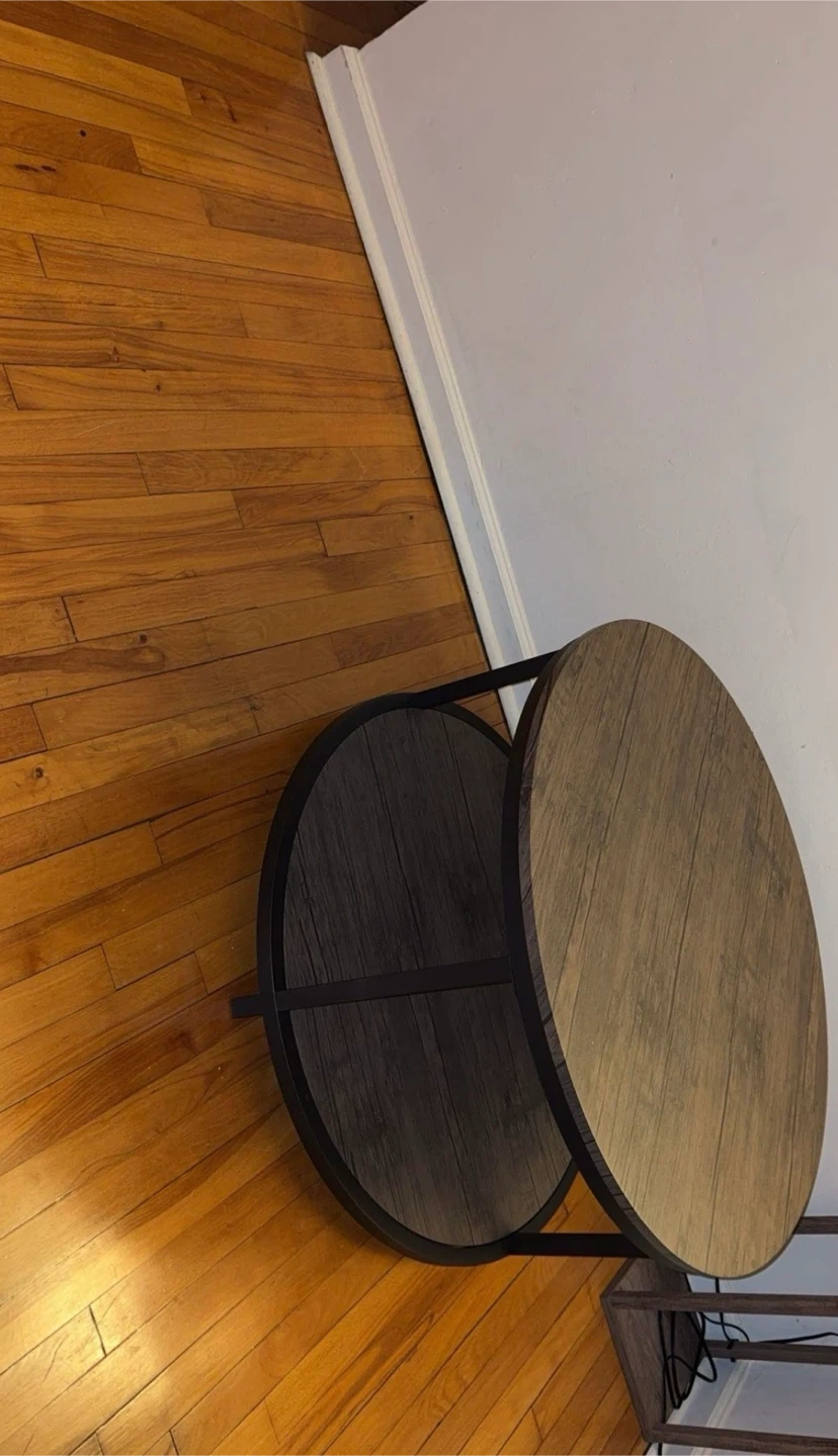 15This is a round side table with two tiers. It features a black metal frame and two round surfaces with different wood-like finishes. It's in great condition and would be a stylish addition to any room!