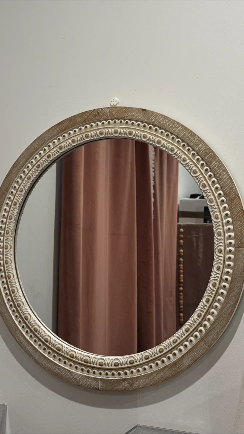 Selling a lovely round wall mirror! It has a charming decorative frame with a light, neutral finish that would complement any room. The mirror is in great condition and ready to add a touch of elegance to your home
