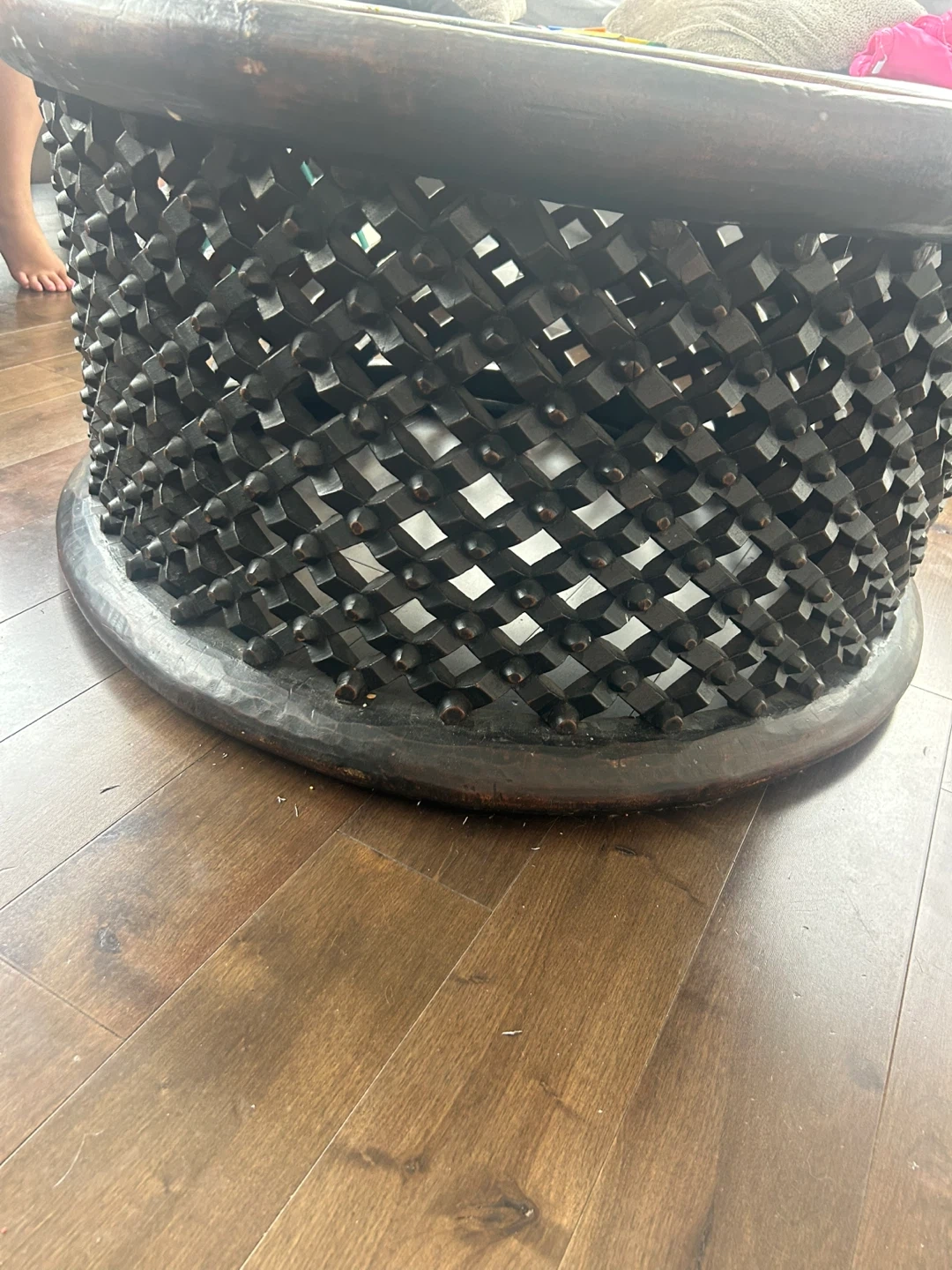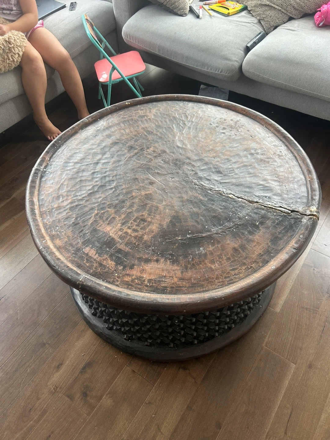 Selling a unique round wood coffee table with a distinctive carved base. It has a rustic, earthy feel that would look great in any living room. The table has a noticeable crack on the surface. Huge crack in front - even though $2k plus will take $100