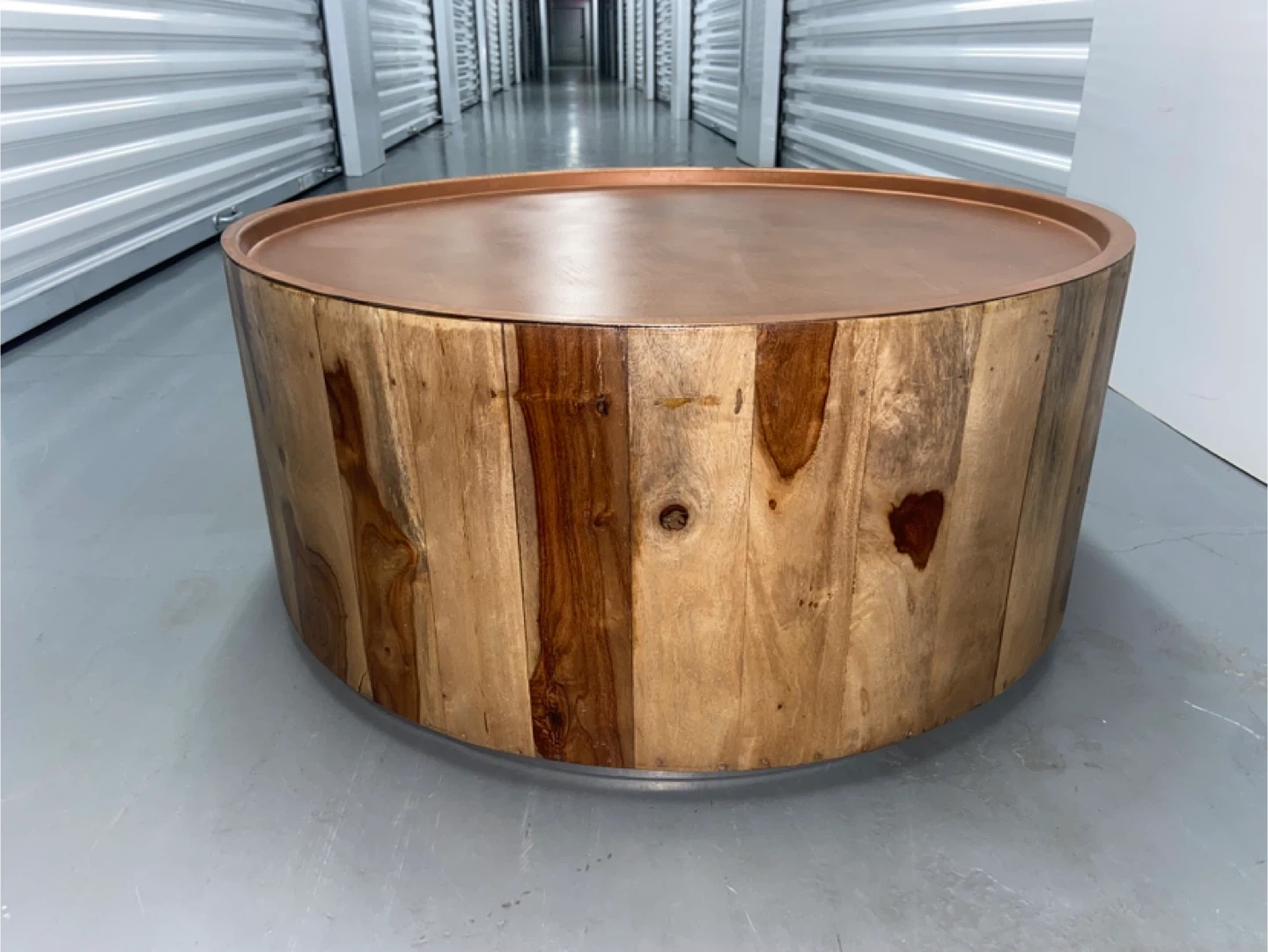 Selling a handmade round coffee table with a unique design! It features a wooden base and a copper-colored top. The table is approximately 26 inches in diameter and 13 inches tall. It would be a great addition to any living room!