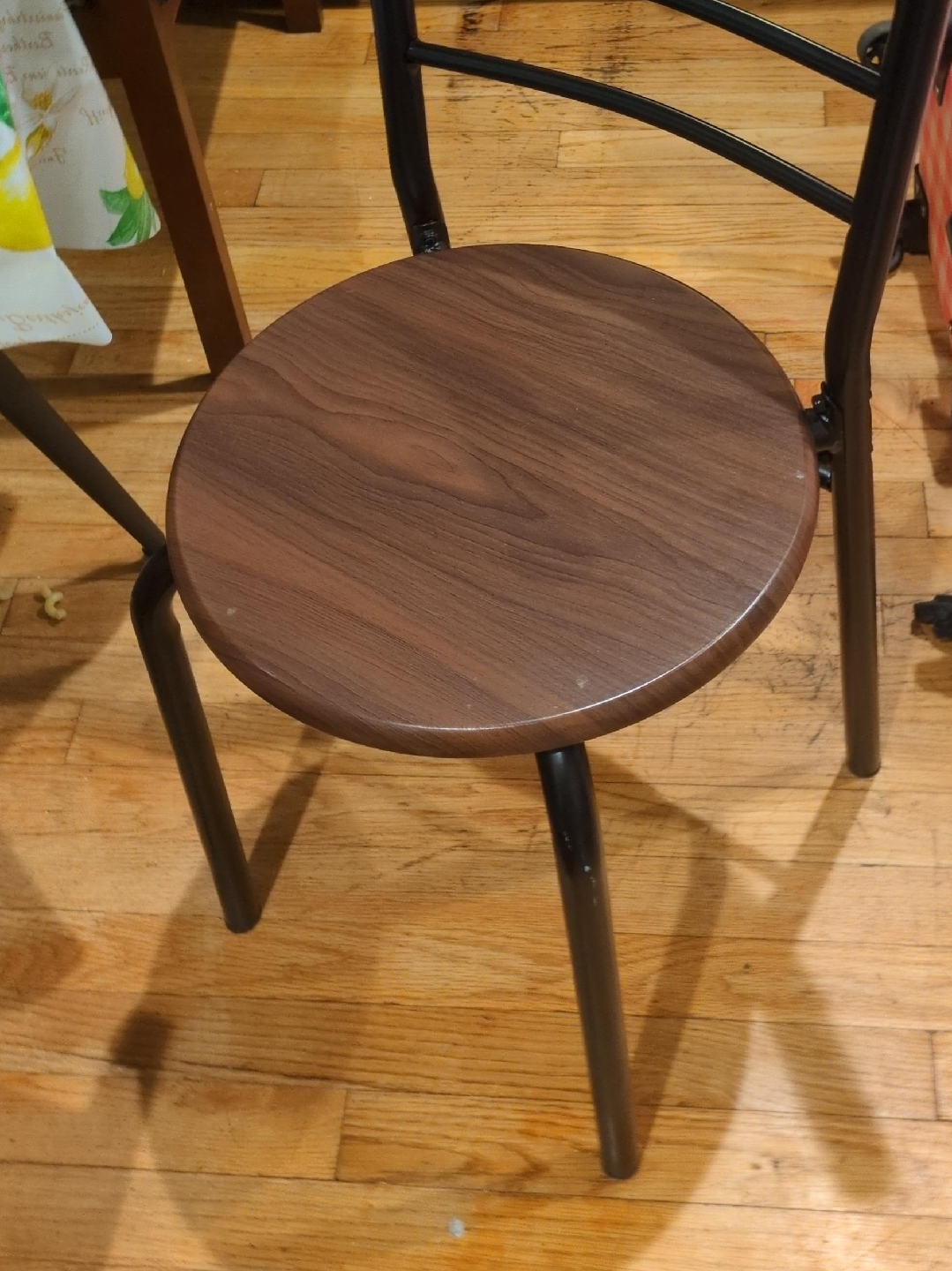 Selling a stool with a round wood top and black metal legs. It's in good condition and ready for a new home!