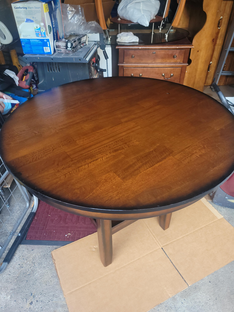 Selling a round wooden dining table. It features a dark brown finish on the tabletop with a slightly darker edge. The table has a sturdy base with four legs, making it a great addition to any dining space