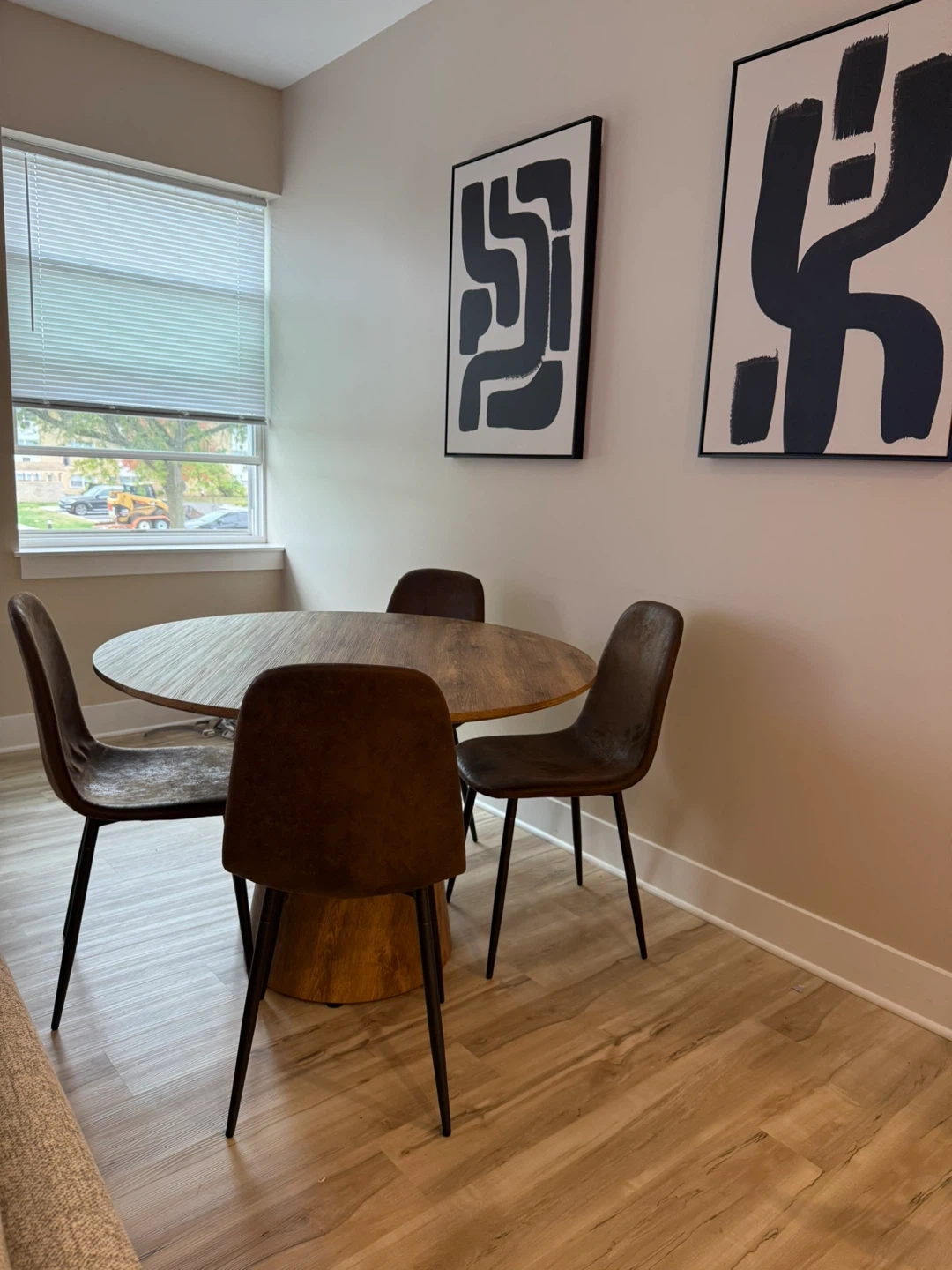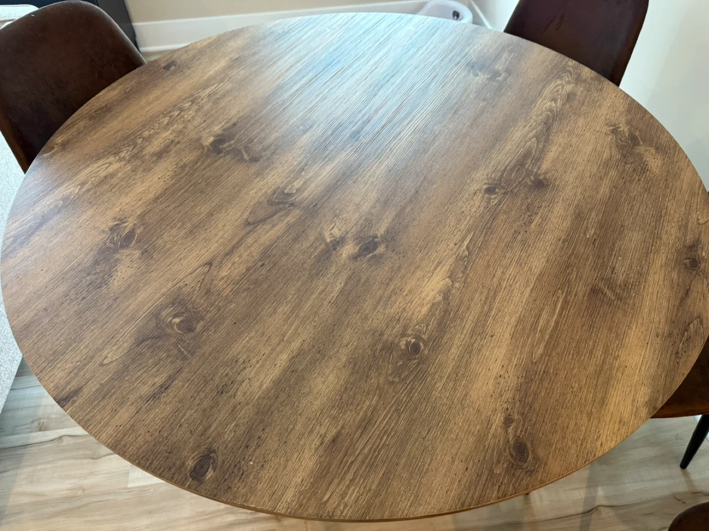 10Selling a round dining table with four chairs. The table has a wooden finish and a unique pedestal base. The chairs are upholstered in a brown material with black legs. Perfect for a small dining area!