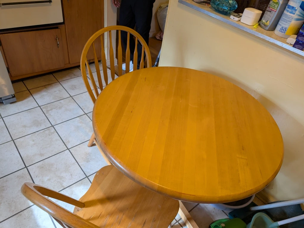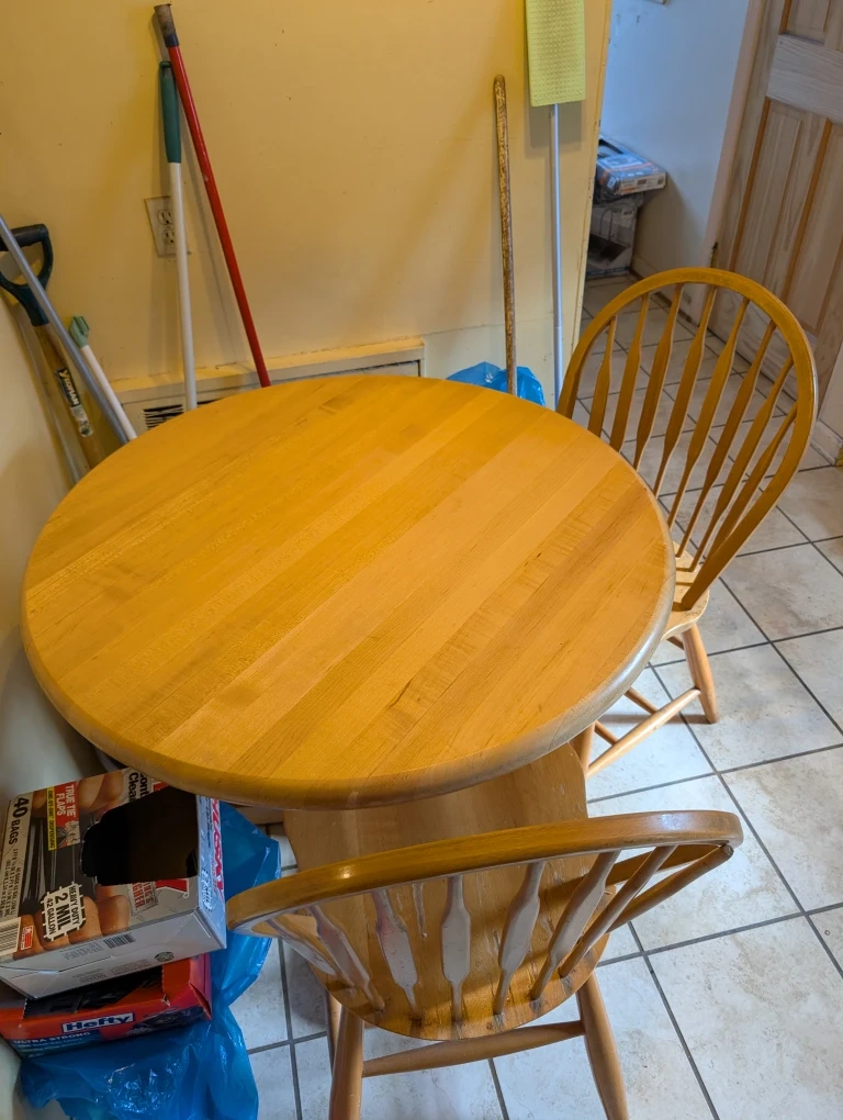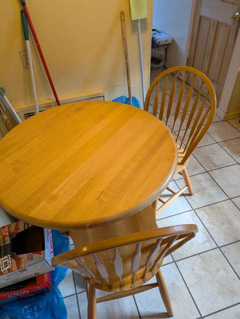 60Selling a cute round wooden table with two matching chairs. It's perfect for a small dining area or breakfast nook. The set is in good condition and ready for a new home!