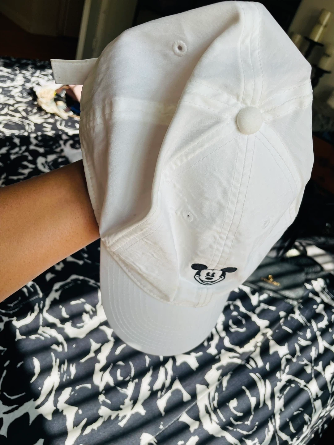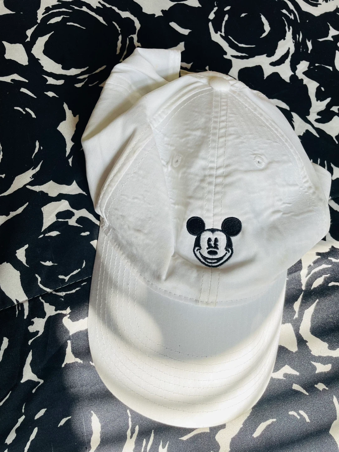 White baseball cap by Nike. It's a Legacy91 Dri-FIT model. Features a small embroidered Mickey Mouse graphic on the front. Adjustable strap on the back.