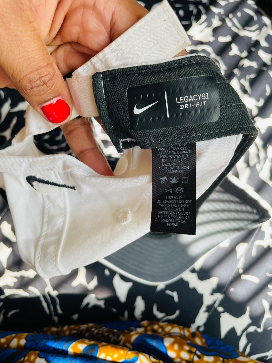 White baseball cap by Nike. It's a Legacy91 Dri-FIT model. Features a small embroidered Mickey Mouse graphic on the front. Adjustable strap on the back.