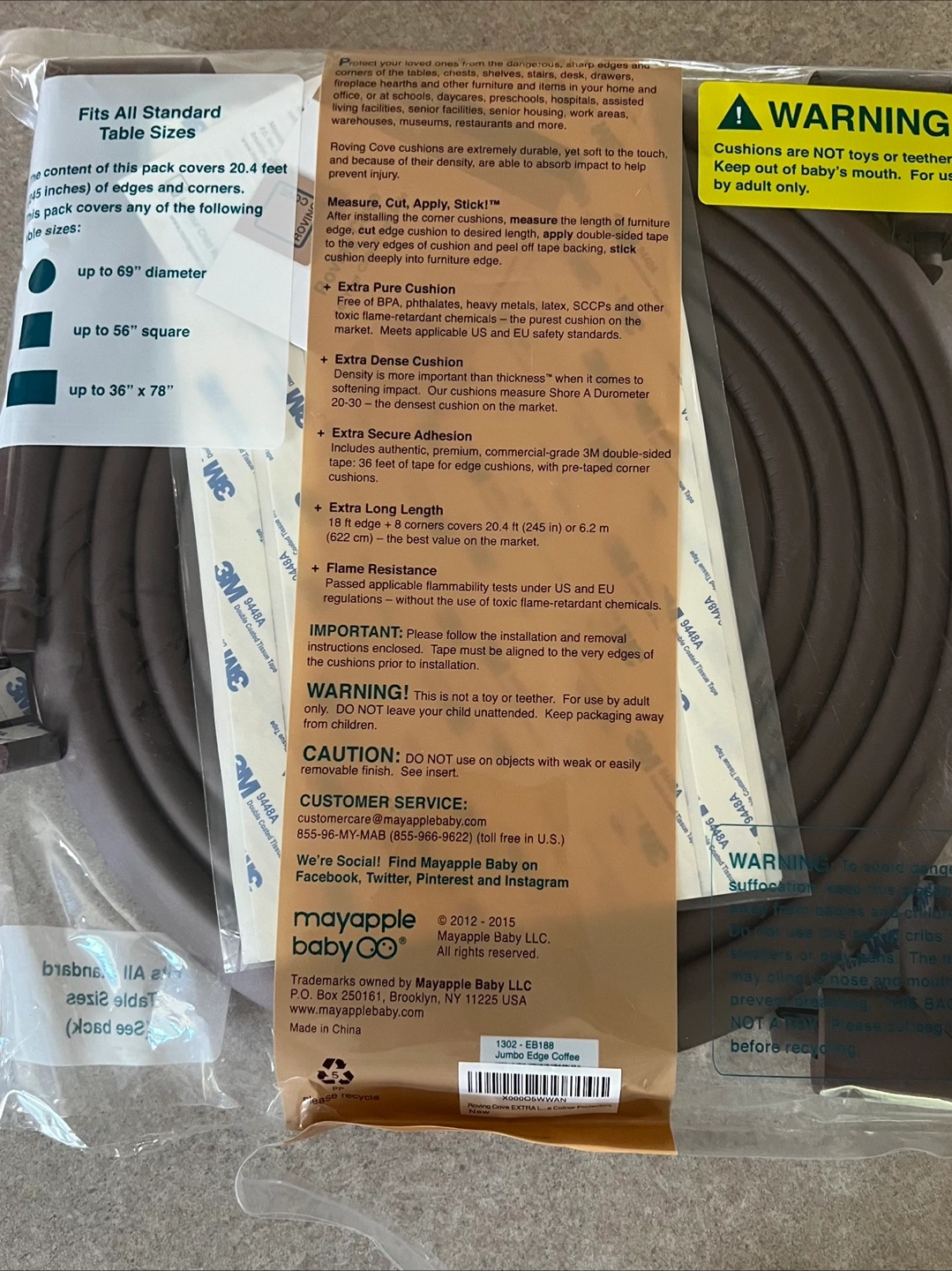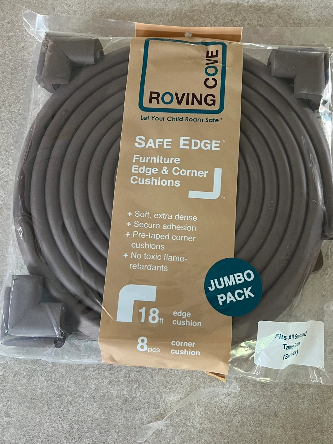 Keep your little ones safe with this Roving Cove Safe Edge Furniture Edge & Corner Cushions Jumbo Pack! This set includes 18 feet of edge cushion and 8 corner cushions. I used 2 corners and small piece of furniture edge. It's designed to fit all standard table sizes and provides extra dense cushioning with secure adhesion. The cushions are flame-resistant and made without toxic materials. Color: Coffee