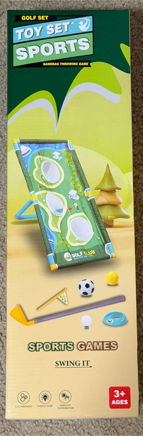 Selling a golf set toy set sports sandbag throwing game. This set is designed for ages 3+. It includes a fun throwing puzzle game that helps with hand-eye coordination