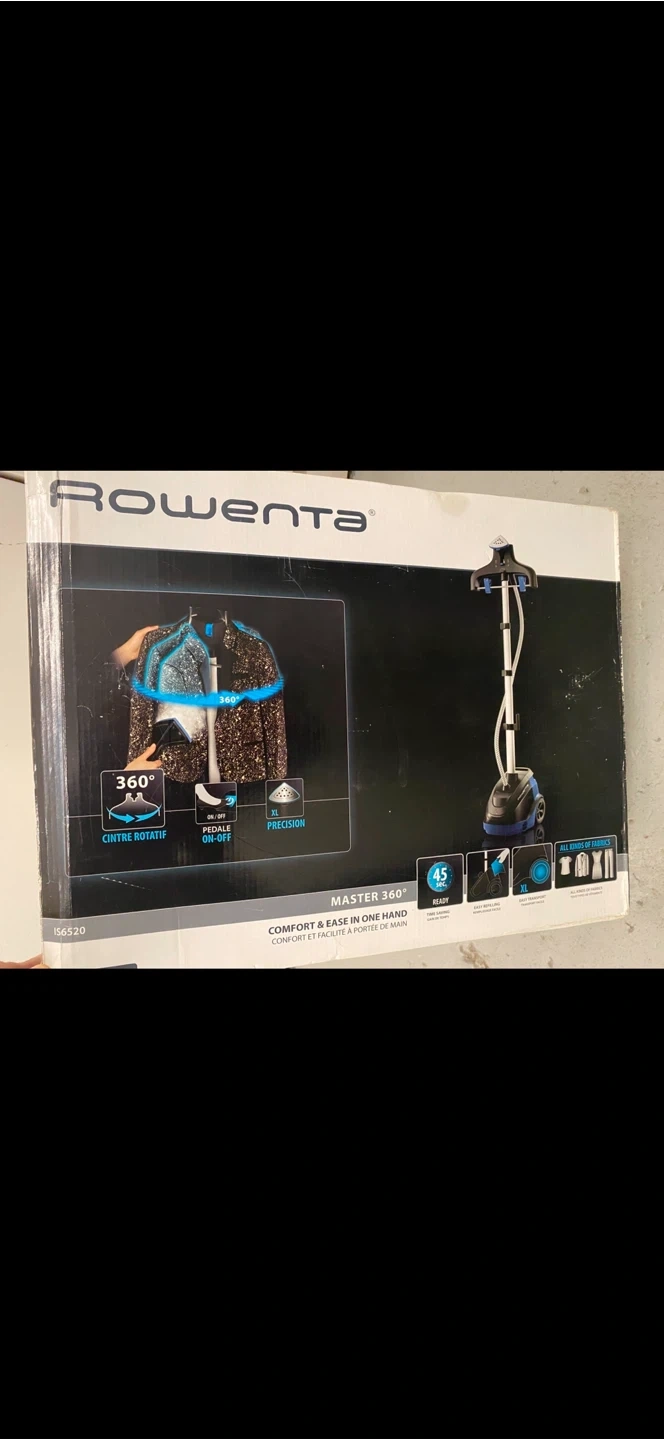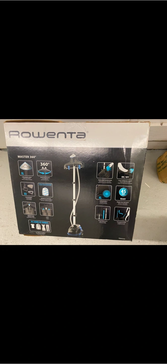 93Selling a Rowenta Master 360° garment steamer! It's designed for comfort and ease in one hand. It's ready to use in just 45 seconds. This steamer works on all kinds of fabrics and features a 360° rotating hanger for efficient steaming. Great for fast touch up on wrinkles and to freshen up clothing.