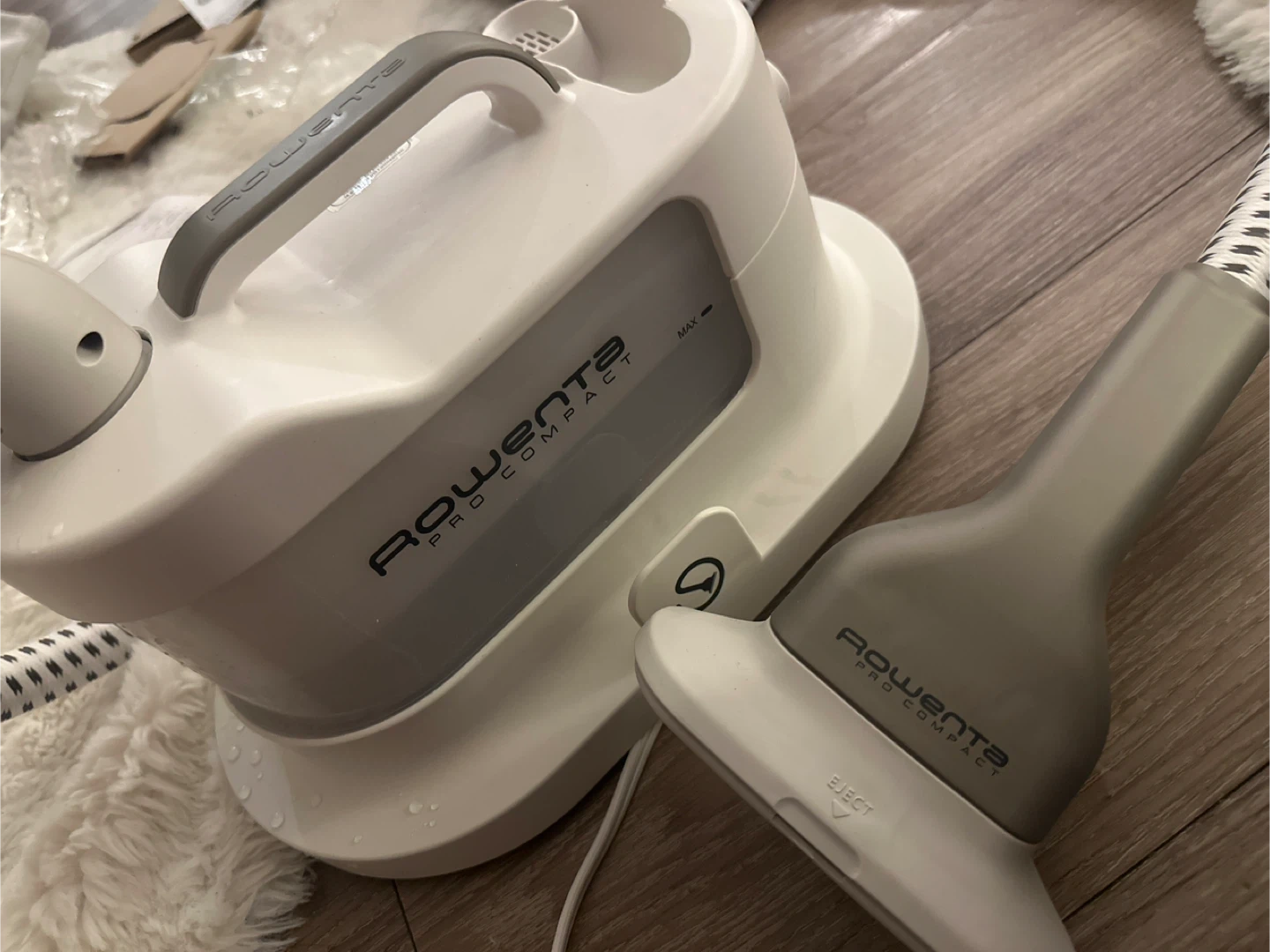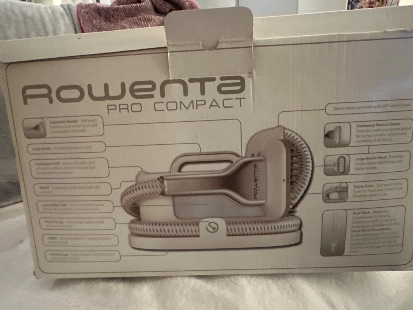 Selling a Rowenta Pro Compact steamer! This steamer features an ergonomic, soft-touch handle and is easy to hold and handle. It also has a continuous refill, with an easy to fill water tank that allows for steaming without having to wait for minutes to add water. The steamer has a large steam head that provides better steam distribution and faster results. It also comes with a large set of accessories!