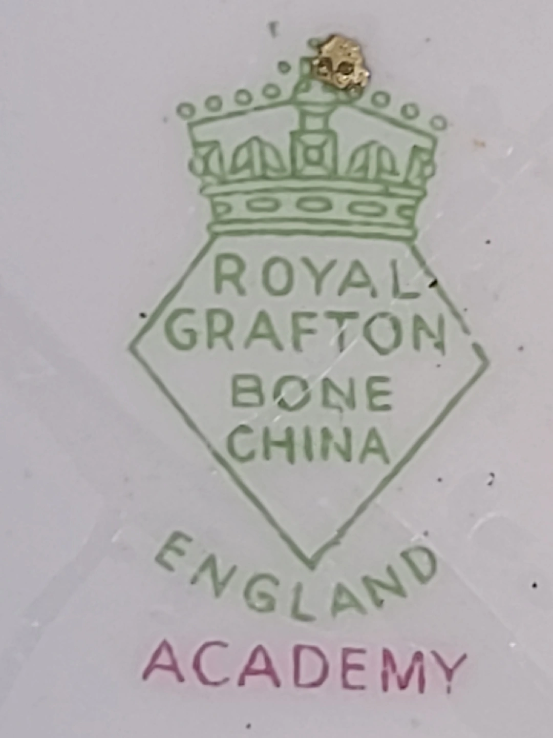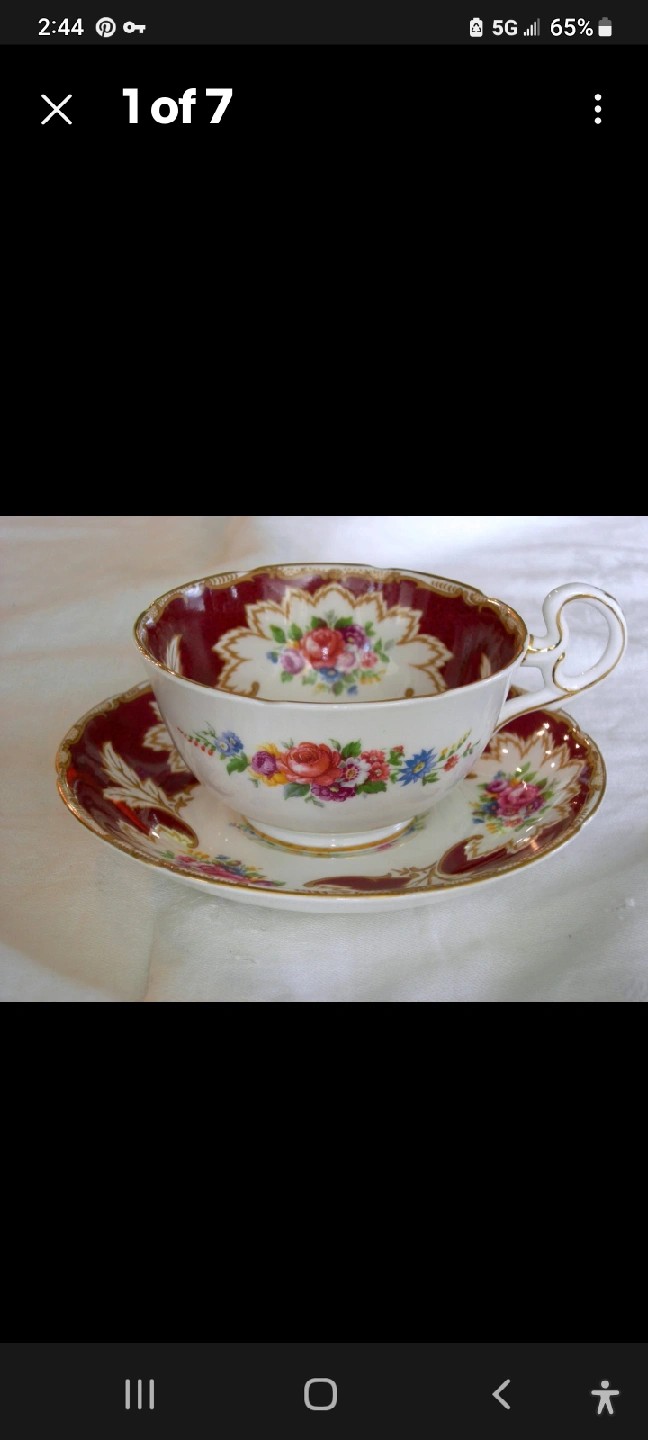 Beautiful Royal Grafton Bone China teacup and saucer set. The pattern features a lovely floral design with a burgundy and gold trim. Perfect for tea time or as a decorative piece!