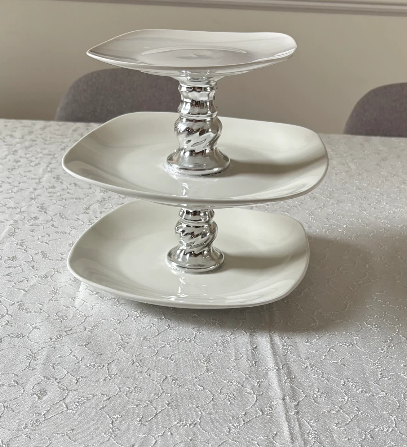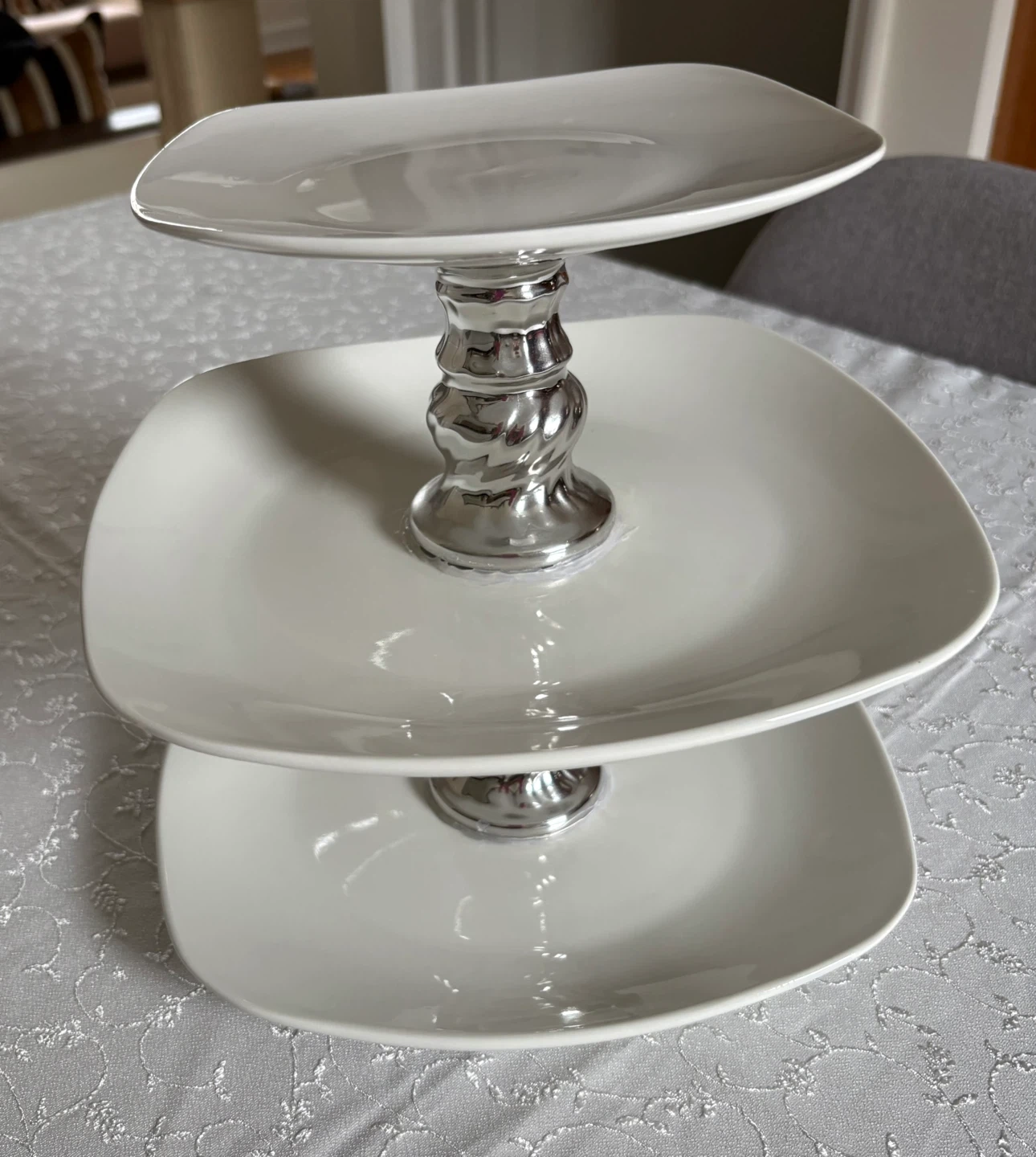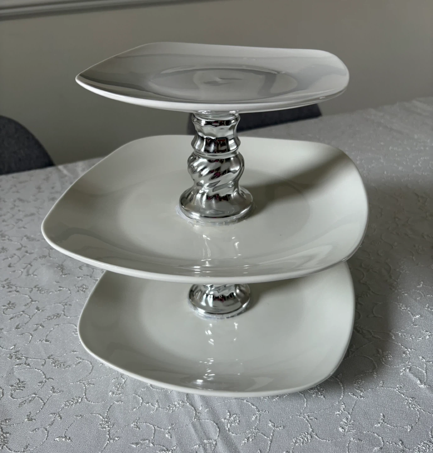 15Here's a lovely Royal Norfolk 3-tier serving stand in great condition! It's perfect for displaying desserts, appetizers, or anything you'd like to showcase at your next gathering. The stand features square plates and a silver-colored stand.