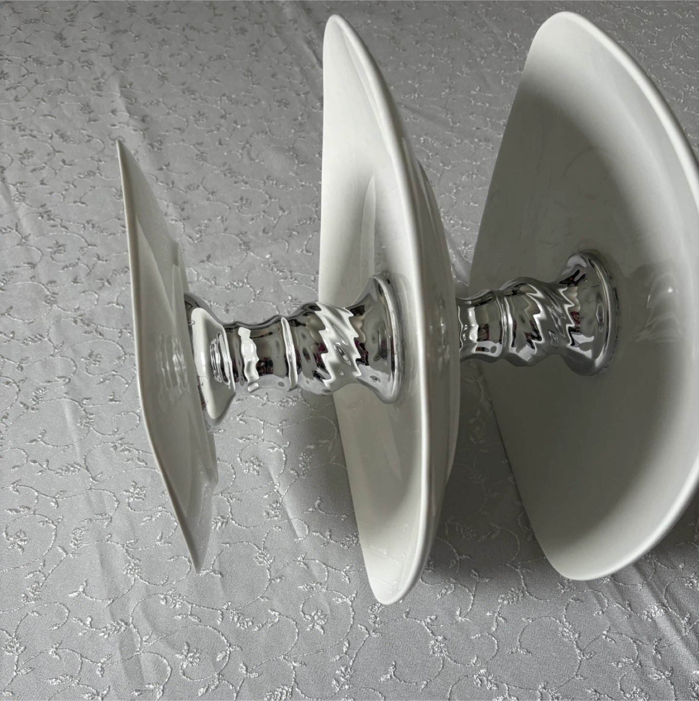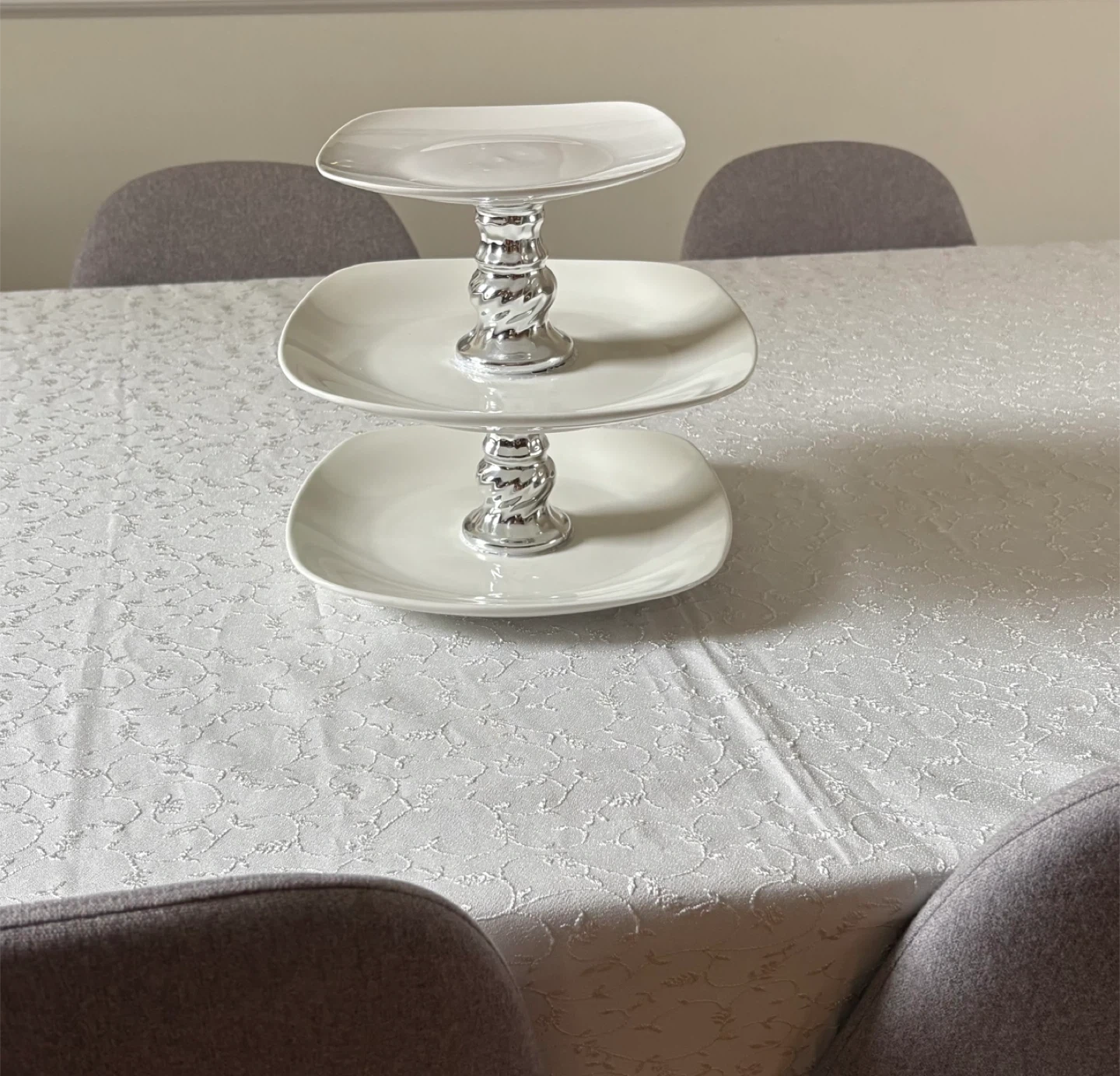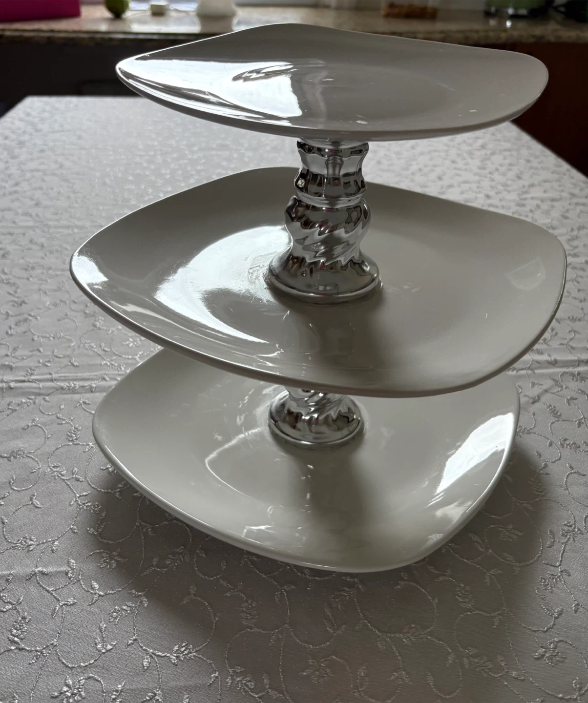 15Here's a lovely Royal Norfolk 3-tier serving stand in great condition! It's perfect for displaying desserts, appetizers, or anything you'd like to showcase at your next gathering. The stand features square plates and a silver-colored stand.