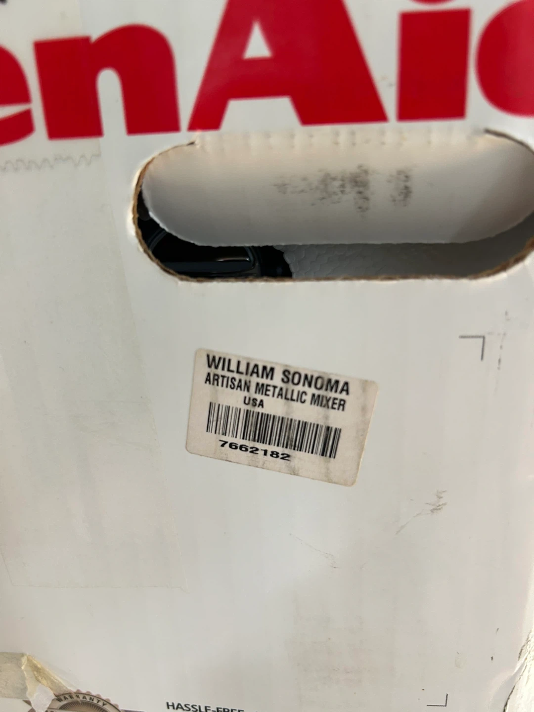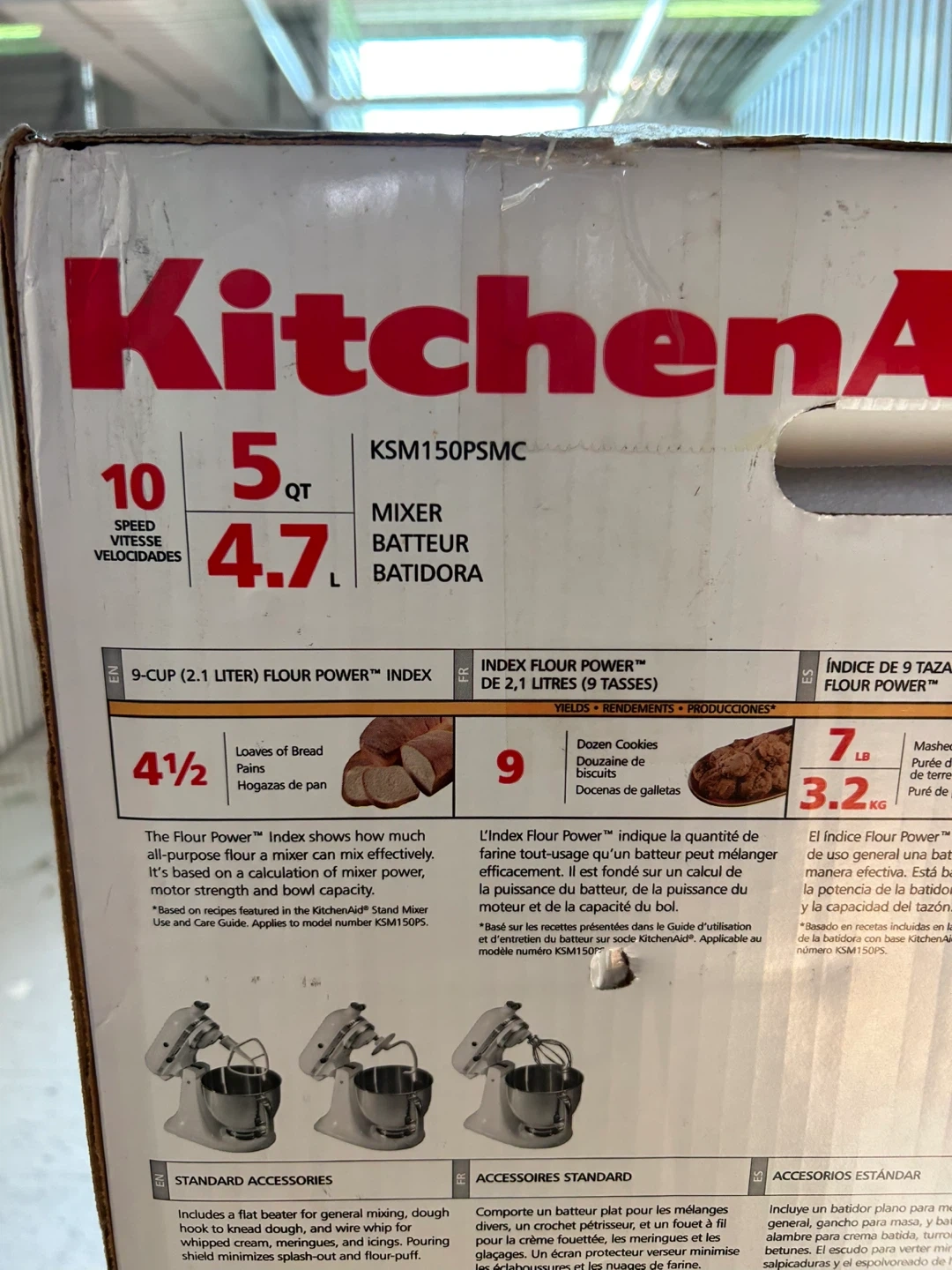 Selling a KitchenAid Artisan mixer, model KSM150PSMC. It's a 5 quart mixer with 10 speeds. Includes a flat beater, dough hook, and wire whip for general mixing, dough kneading, and aerating. The box is included
