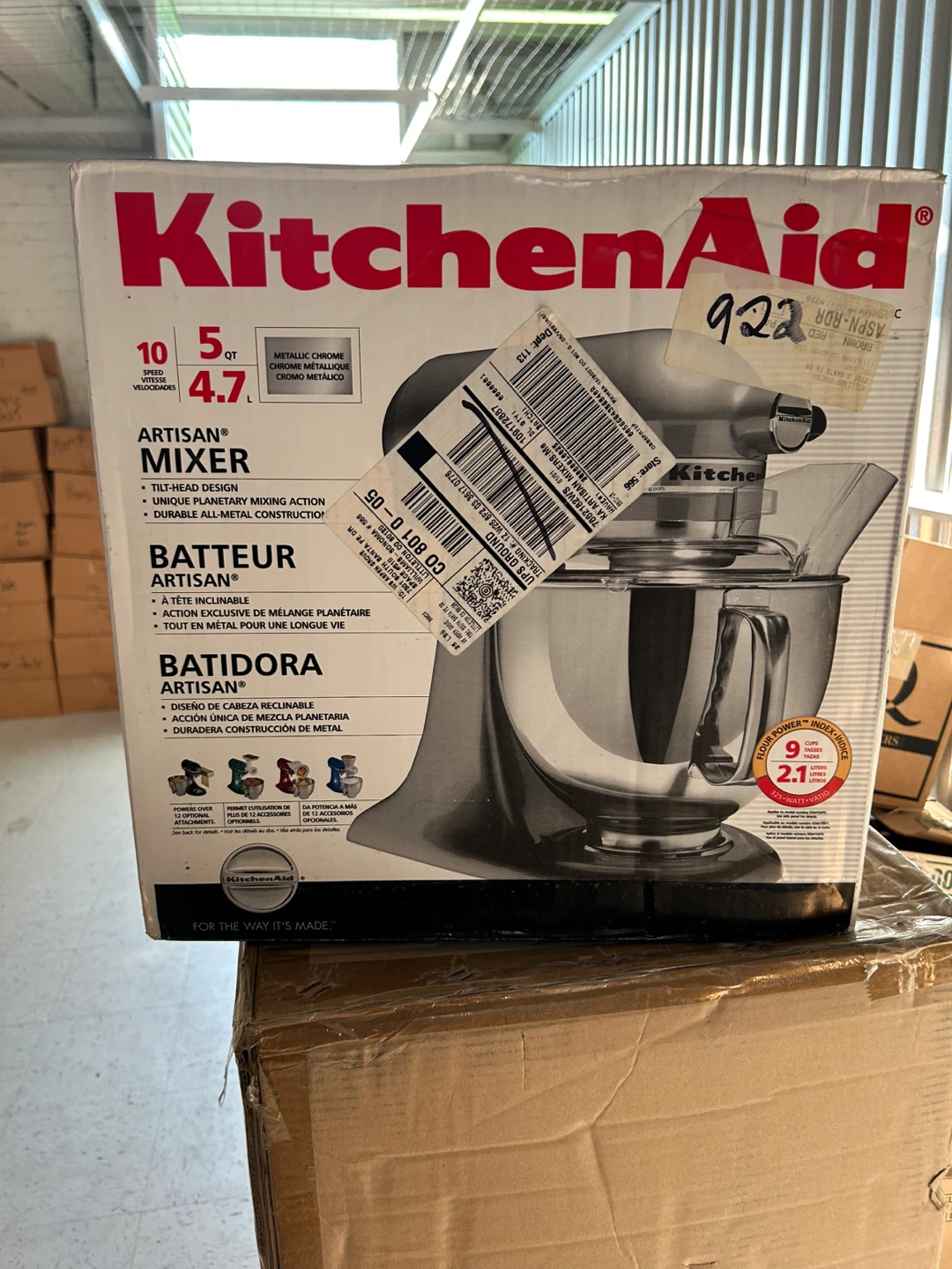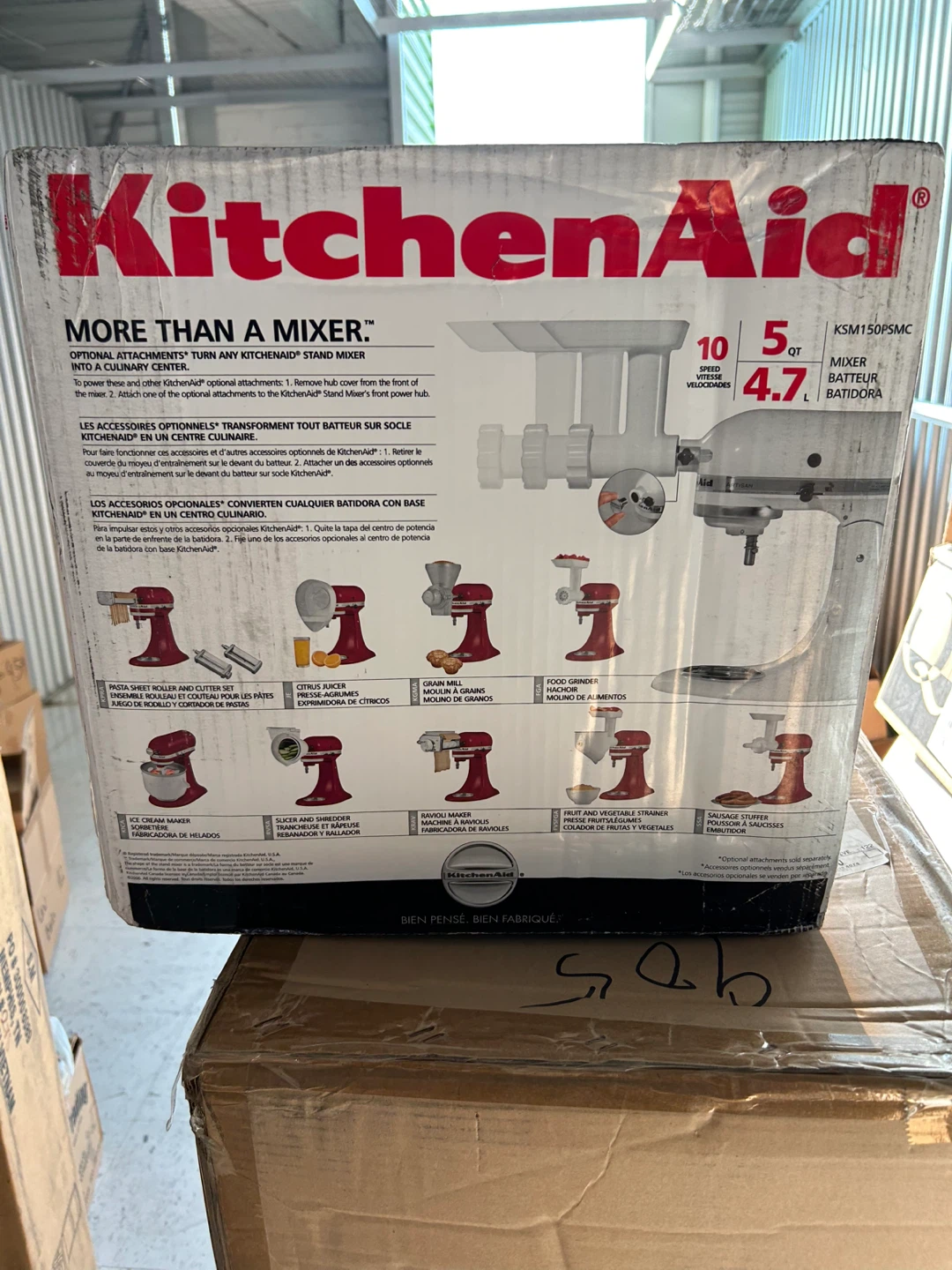 Selling a KitchenAid Artisan mixer, model KSM150PSMC. It's a 5 quart mixer with 10 speeds. Includes a flat beater, dough hook, and wire whip for general mixing, dough kneading, and aerating. The box is included