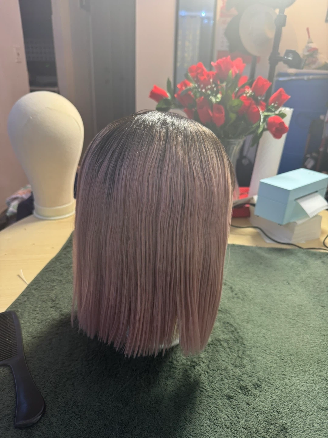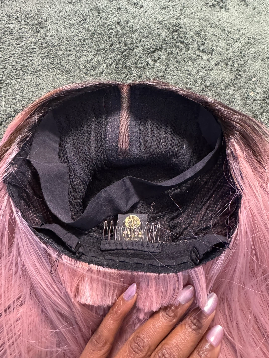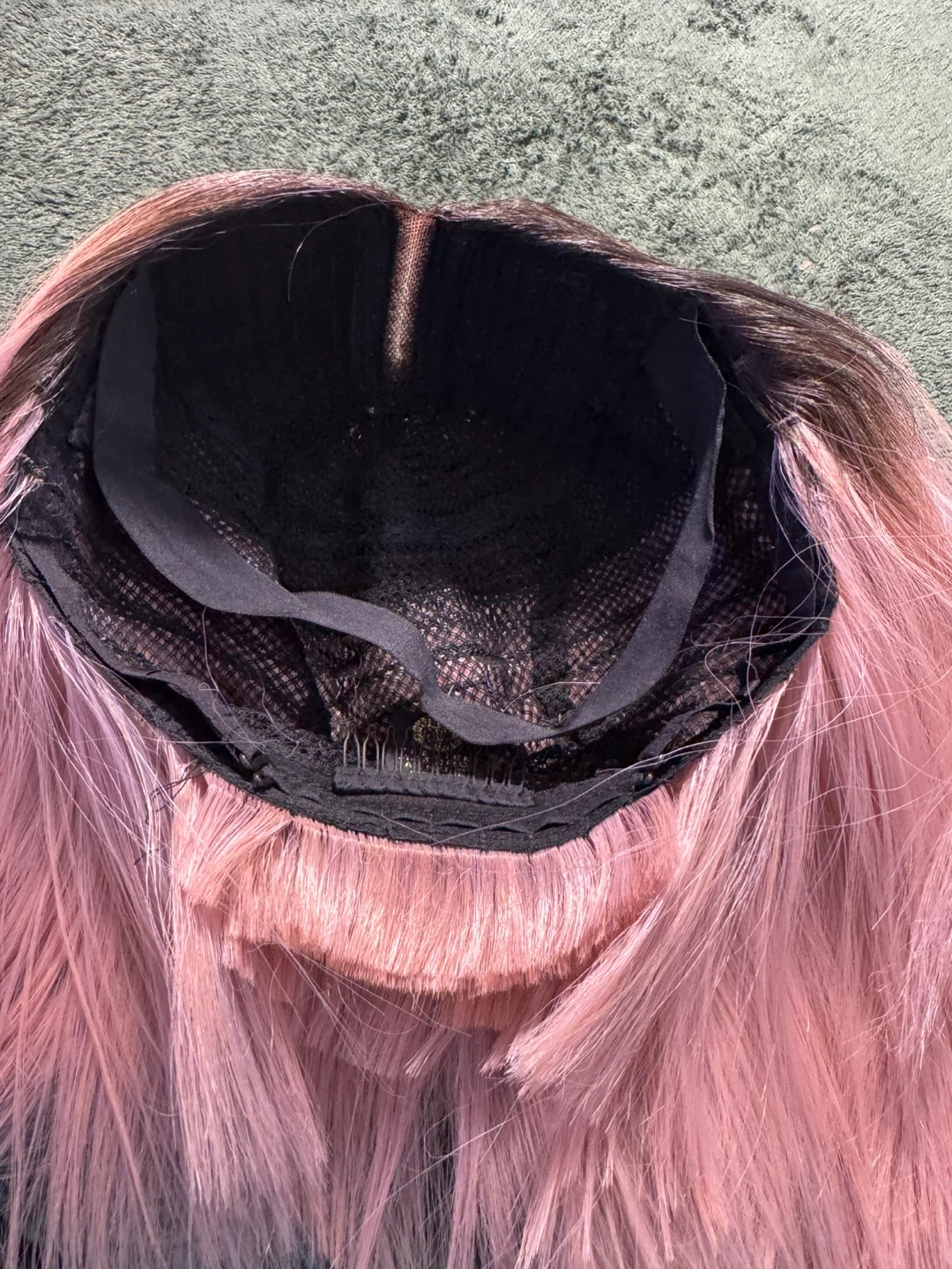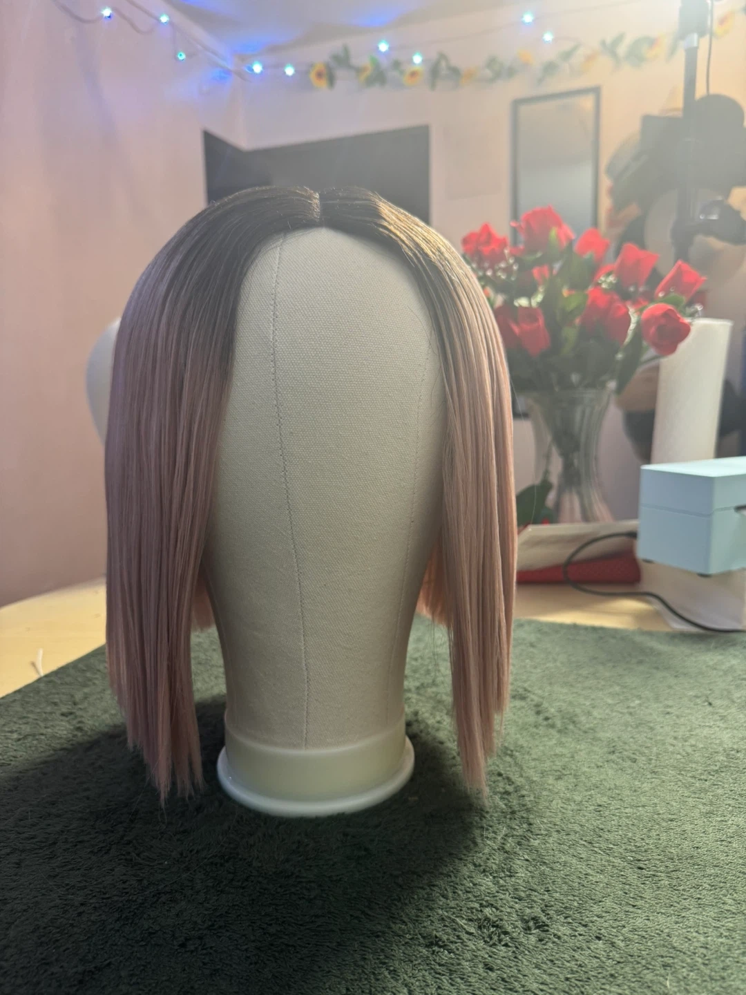 This is a stylish bob wig with dark roots fading into a soft pink. It's a synthetic wig with a natural looking part. This wig is great for a quick style change or special occasions!