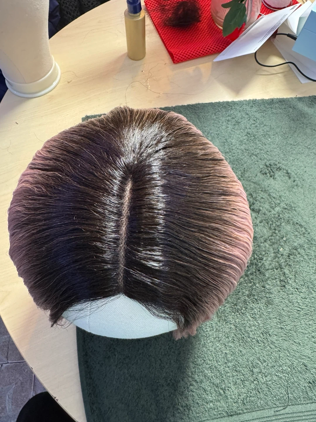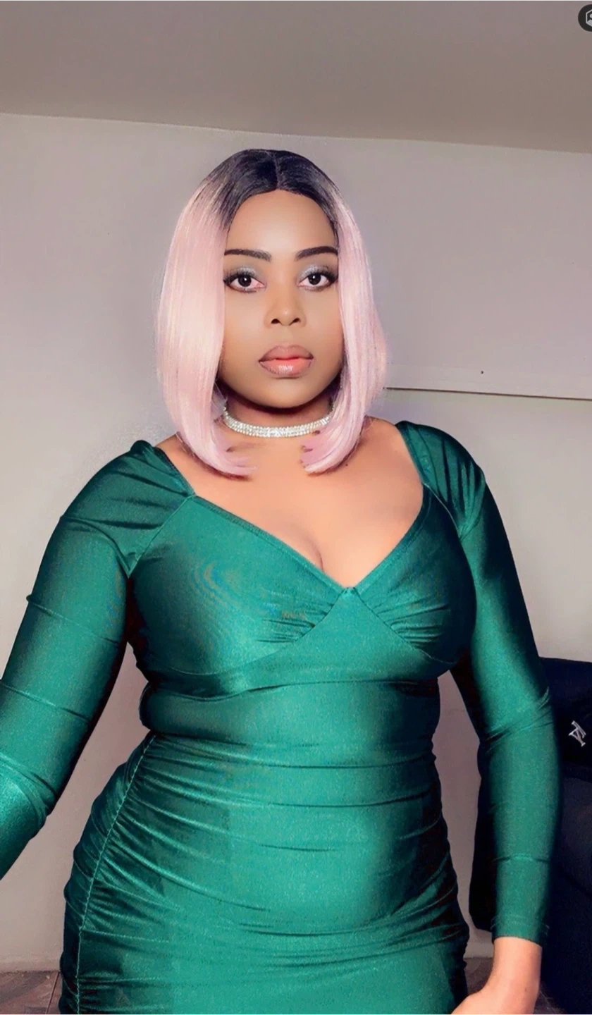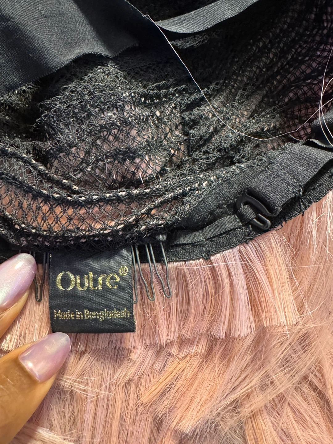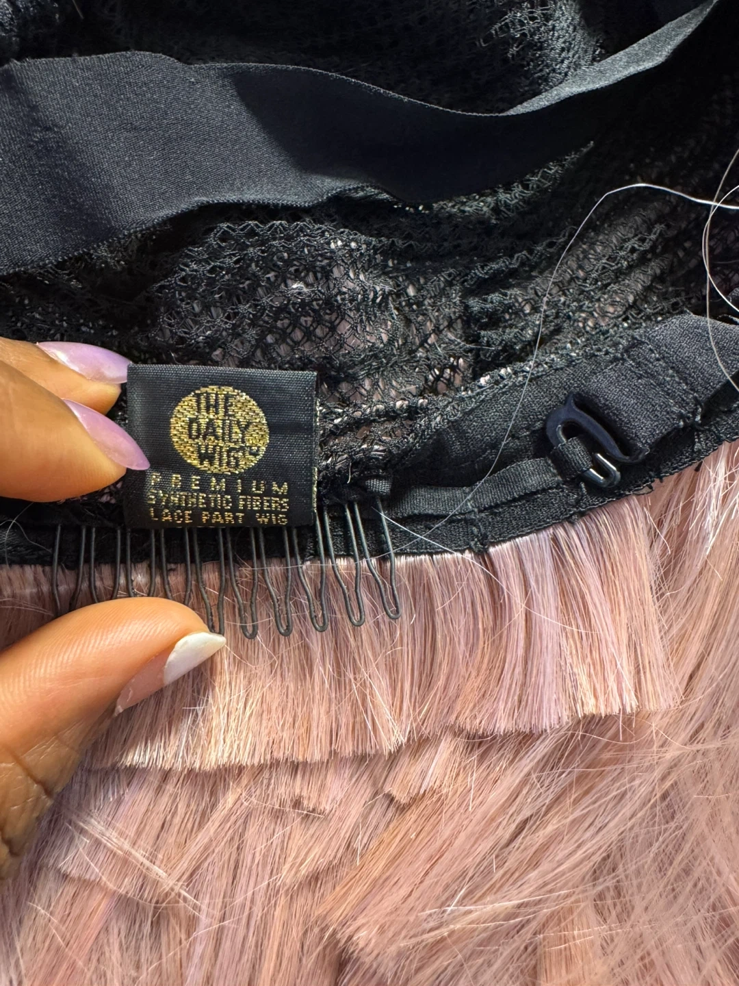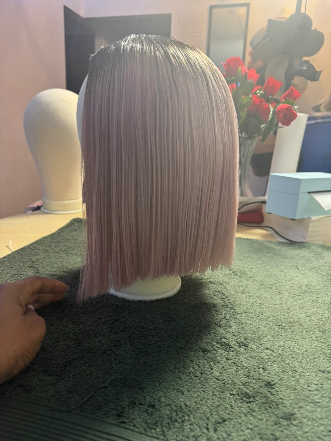 This is a stylish bob wig with dark roots fading into a soft pink. It's a synthetic wig with a natural looking part. This wig is great for a quick style change or special occasions!