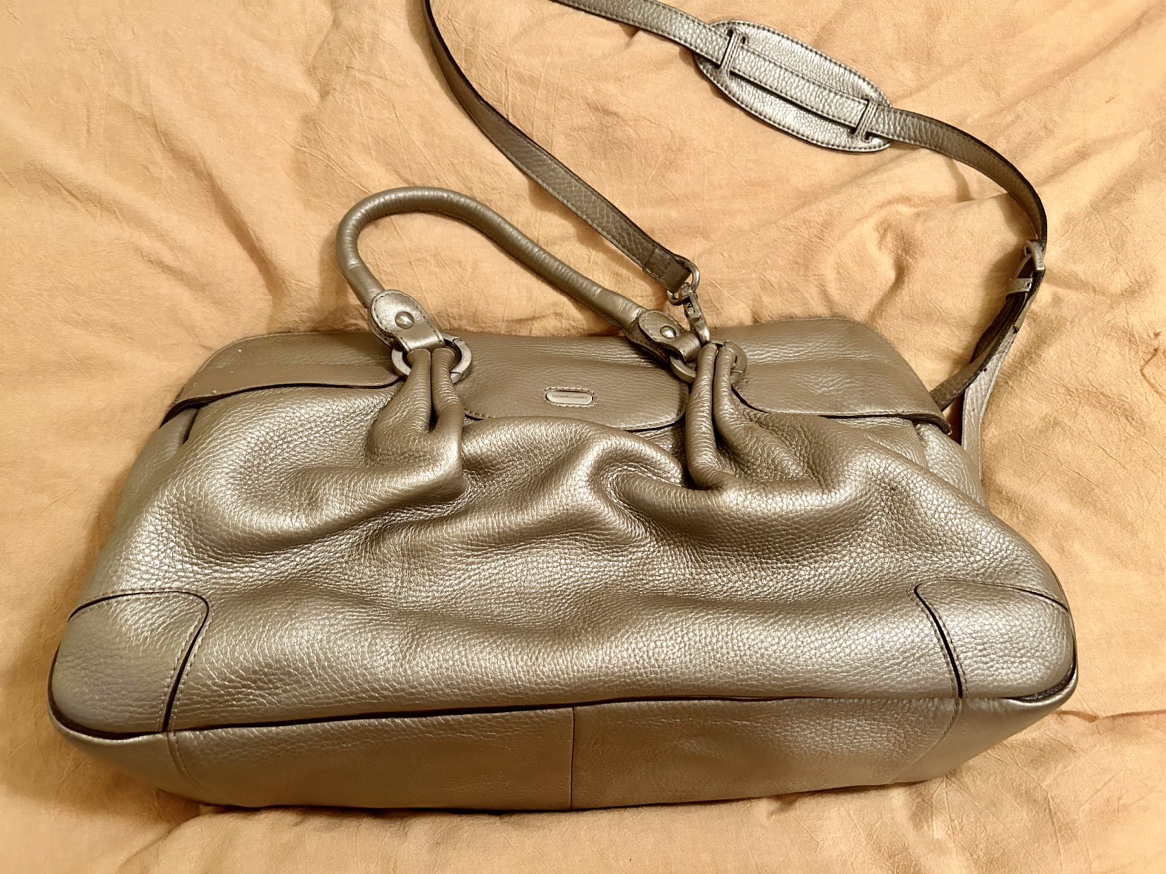 This bag is in very good pre-owned condition. It has five different compartments, 20 inches wide , 14 inches tall. It is all leather .