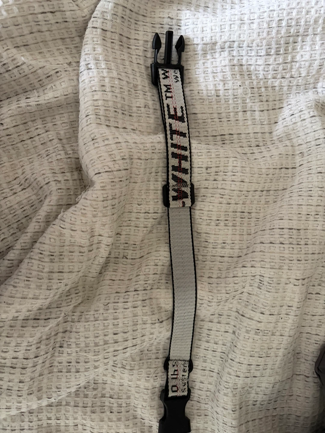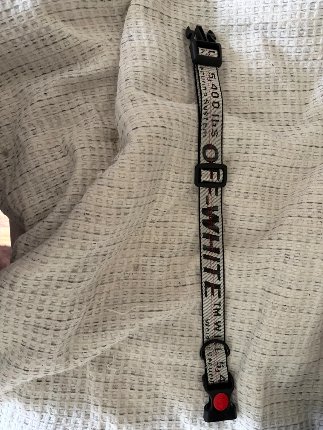 OFF-WHITE industrial belt with black and white diagonal stripe pattern. Features a buckle closure and "5,400 lbs" text detailing. Strap is adjustable.