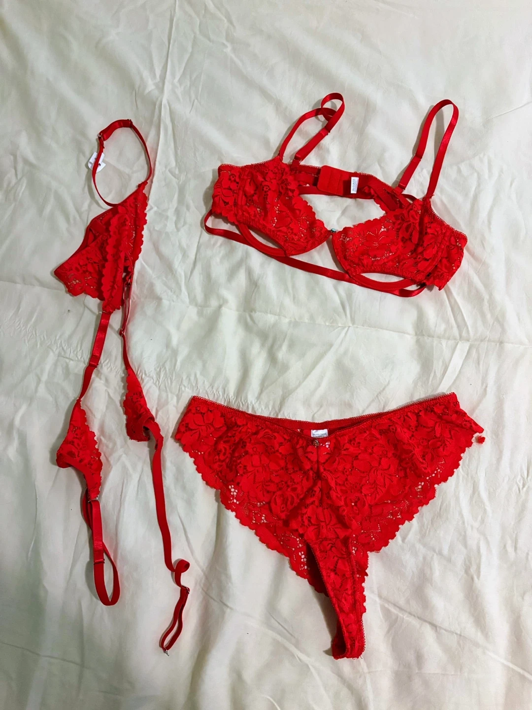 This red lace lingerie set includes a bra and thong. It's made of 95% polyester and 5% elastane. Bra features adjustable straps and a cut-out design. Thong has a comfortable fit.