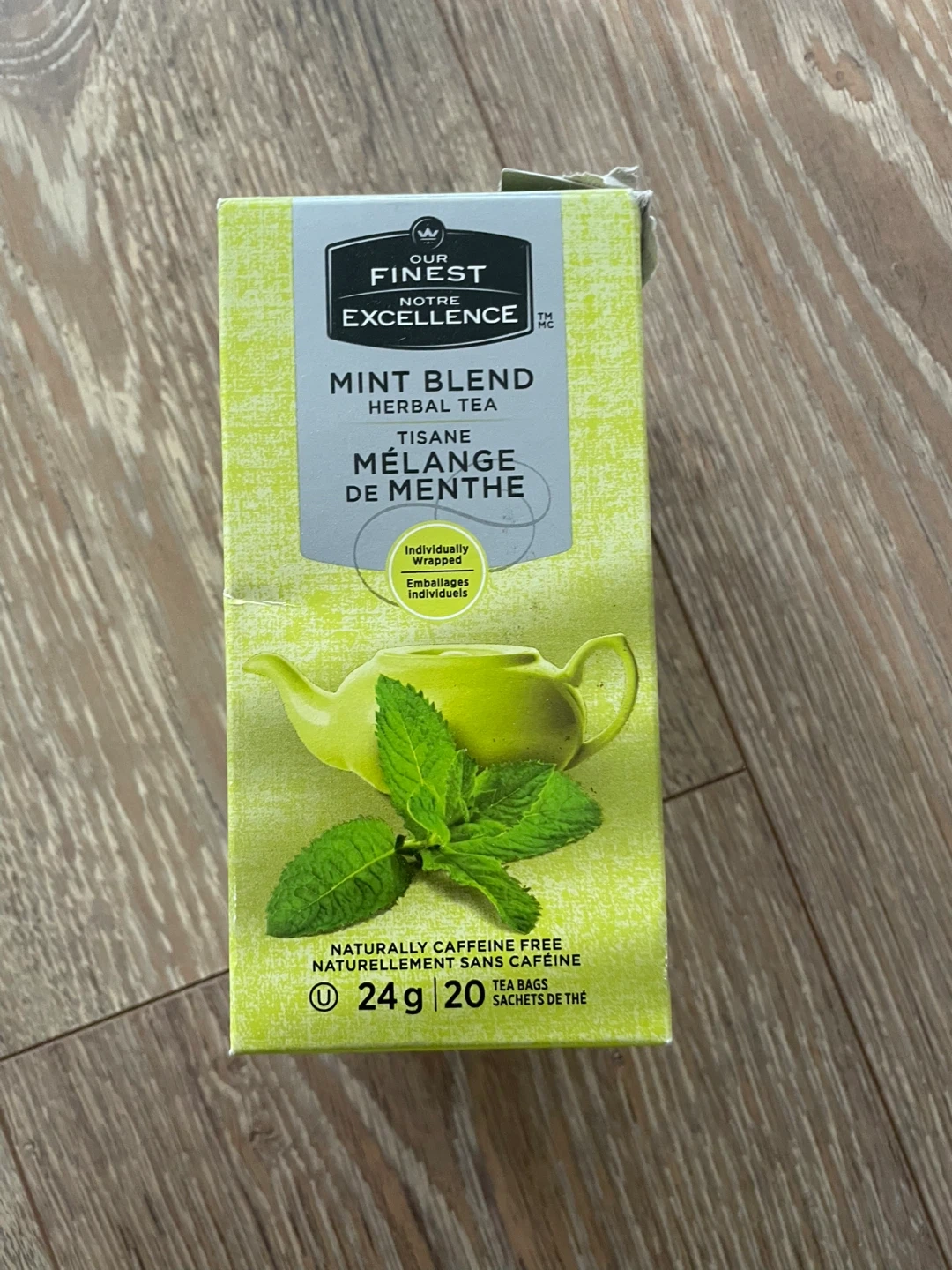 Our Finest Mint Blend Herbal Tea. Naturally caffeine free. Individually wrapped tea bags. 14 tea bags, 24g total.